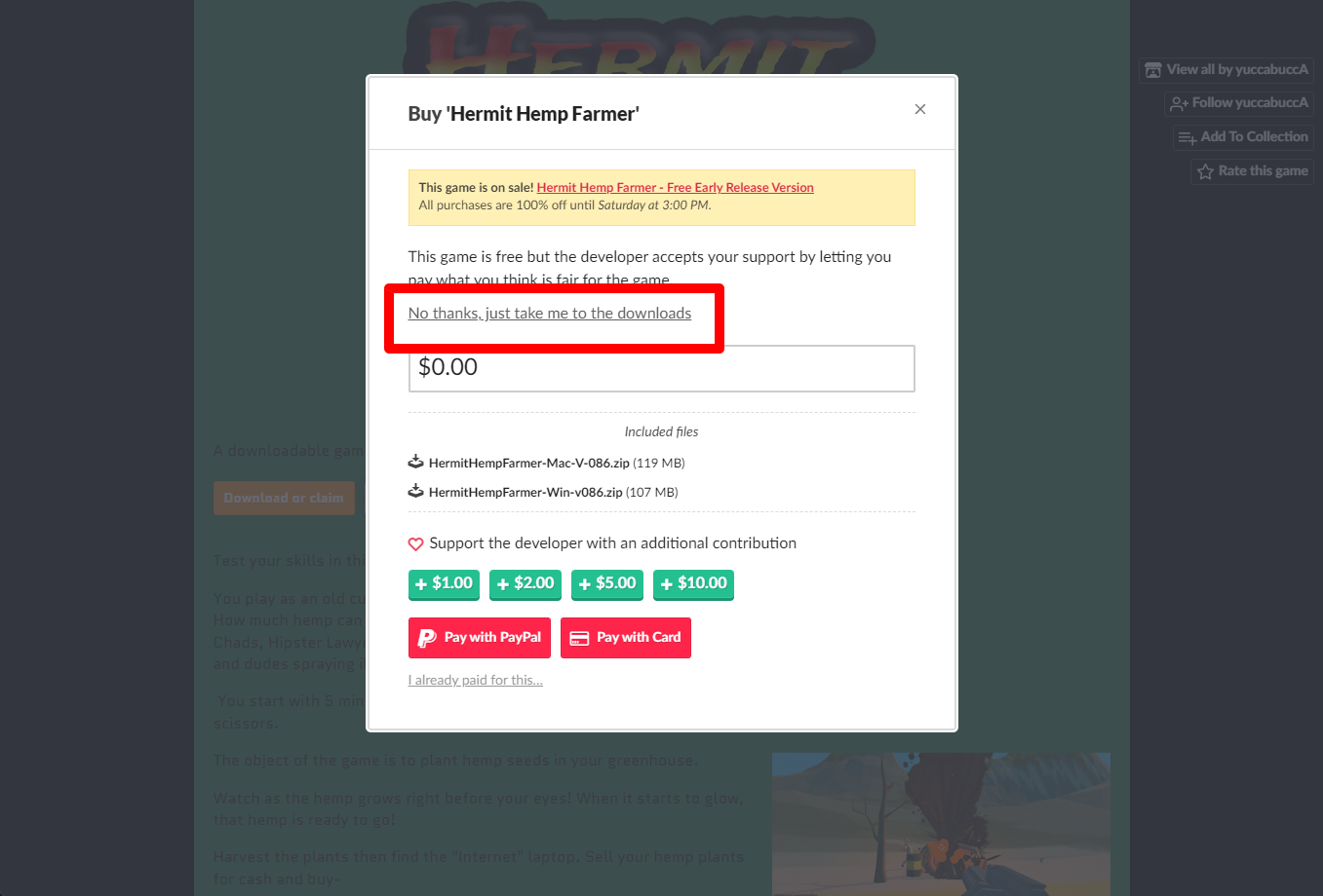 "Hermit Hemp Farmer" 구매창에서 [No thanks, just take me to the downloads] 링크를 클릭합니다.