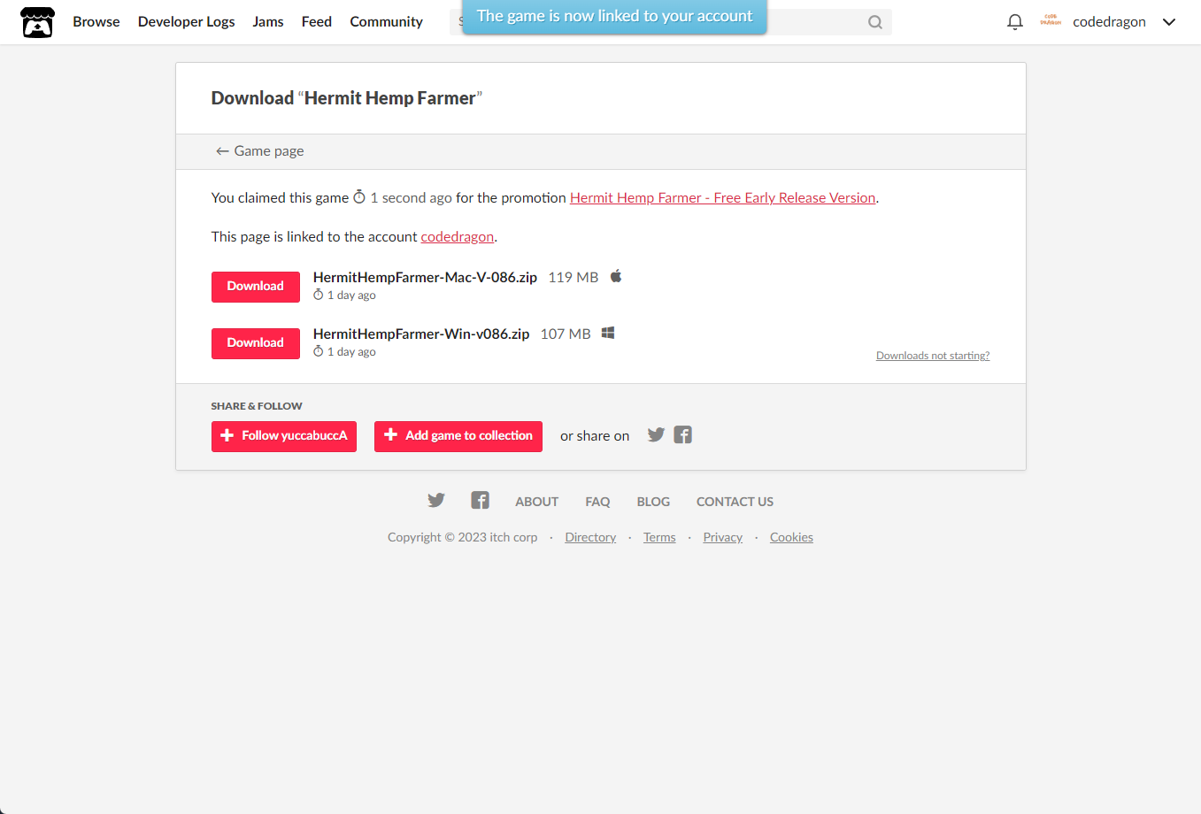 [Claim game]을 클릭하면 "Hermit Hemp Farmer" 게임이 나의 게임 라이브러리에 추가되고 설치파일을 다운받을 수 있는 페이지로 이동됩니다.
