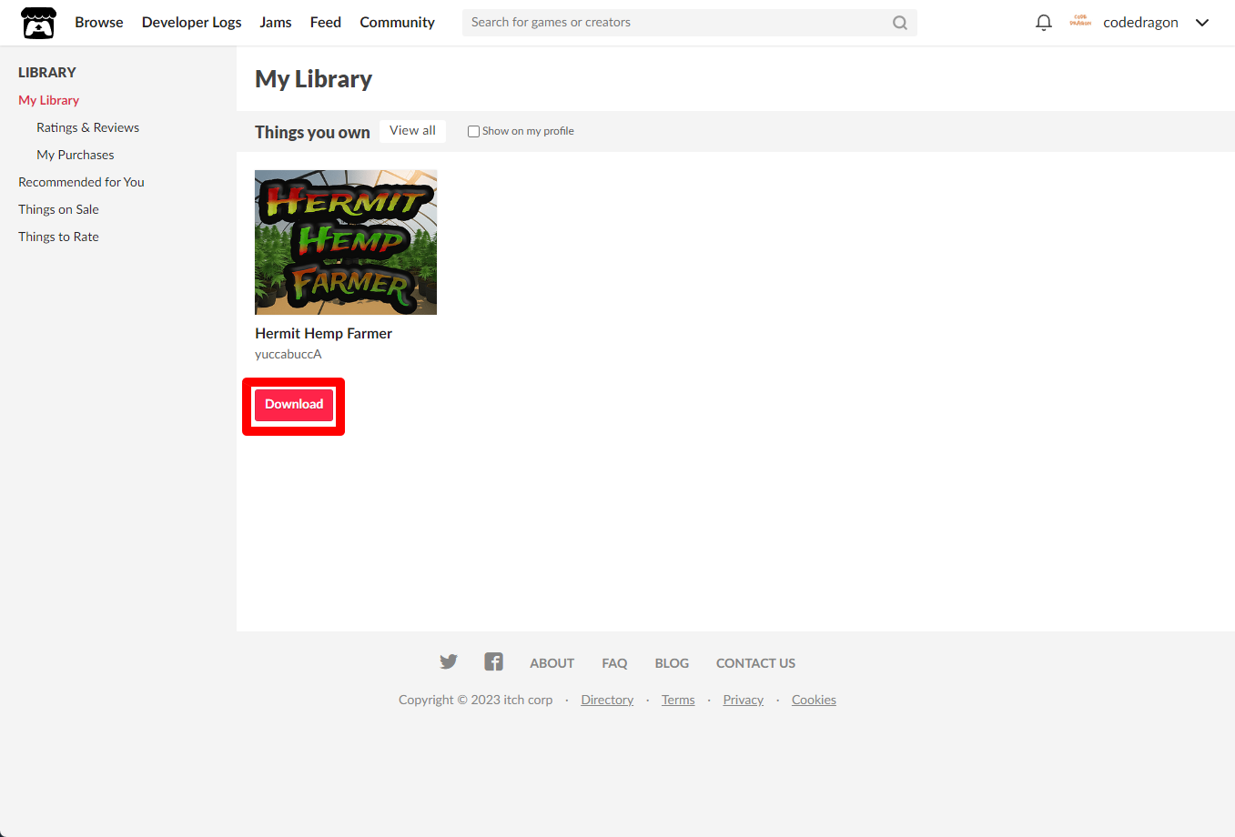"My Lirary"에서 방금 받은 "Hermit Hemp Farmer" 게임 항목을 확인할 수 있습니다.