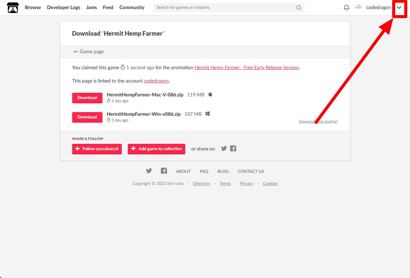 itch.io에서 받은 "Hermit Hemp Farmer" 게임 확인하고 설치파일 다운받아 보겠습니다. 우측 상단의 나의 사용자명 오른쪽의 화살표 아이콘을 클릭합니다.