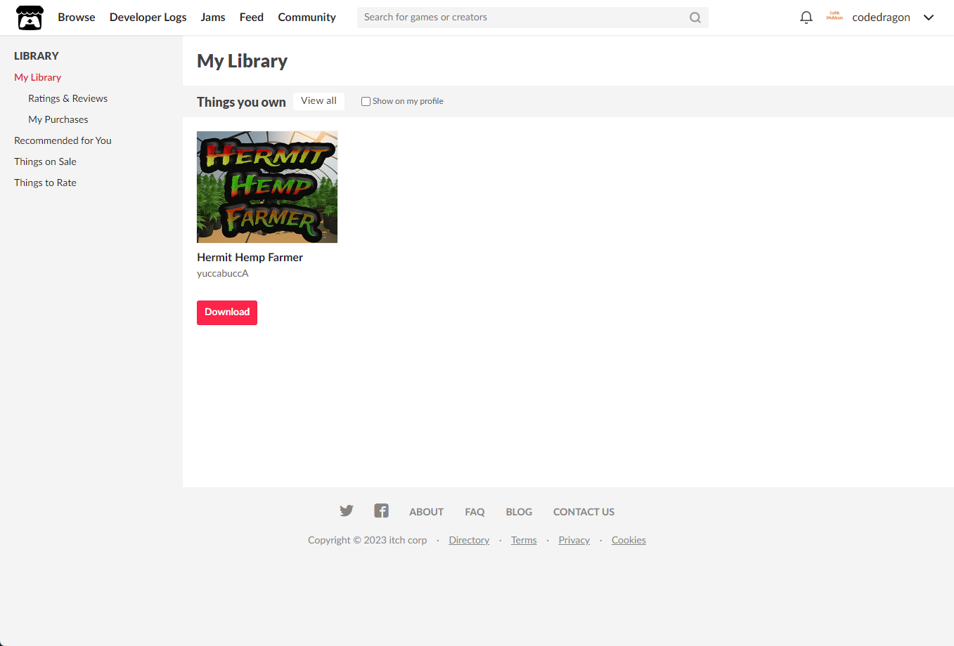 [Claim game]을 클릭하면 "Hermit Hemp Farmer" 게임이 나의 게임 라이브러리에 추가되고 설치파일을 다운받을 수 있는 페이지로 이동됩니다.