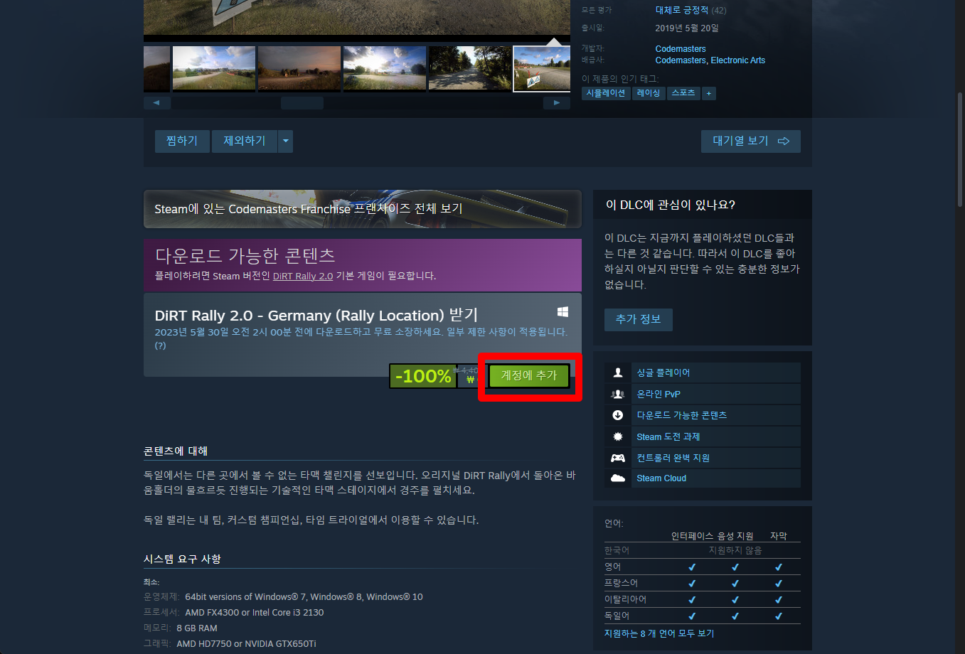 "DiRT Rally 2.0 - Germany (Rally Location)" 게임페이지를 조금 내려준 후 [계정에 추가] 버튼을 클릭하면 게임라이브러리에 추가됩니다.