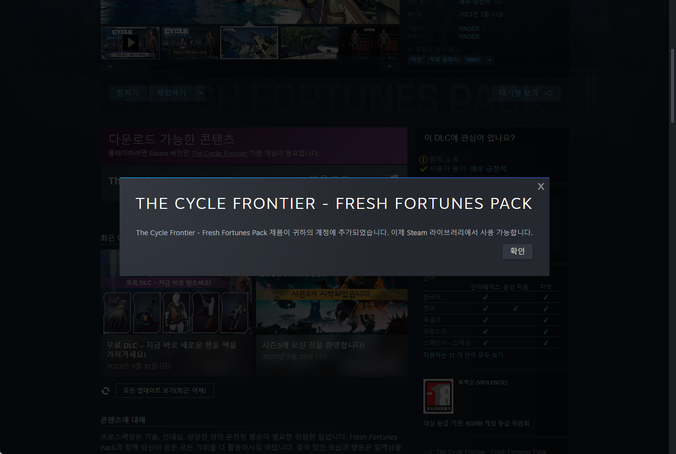 다시 "The Cycle Frontier - Fresh Fortunes Pack" 게임페이지로 돌아와 보면 녹색으로 표시되어 있어 게임라이브러리에 추가되었음을 확인할 수 있습니다.