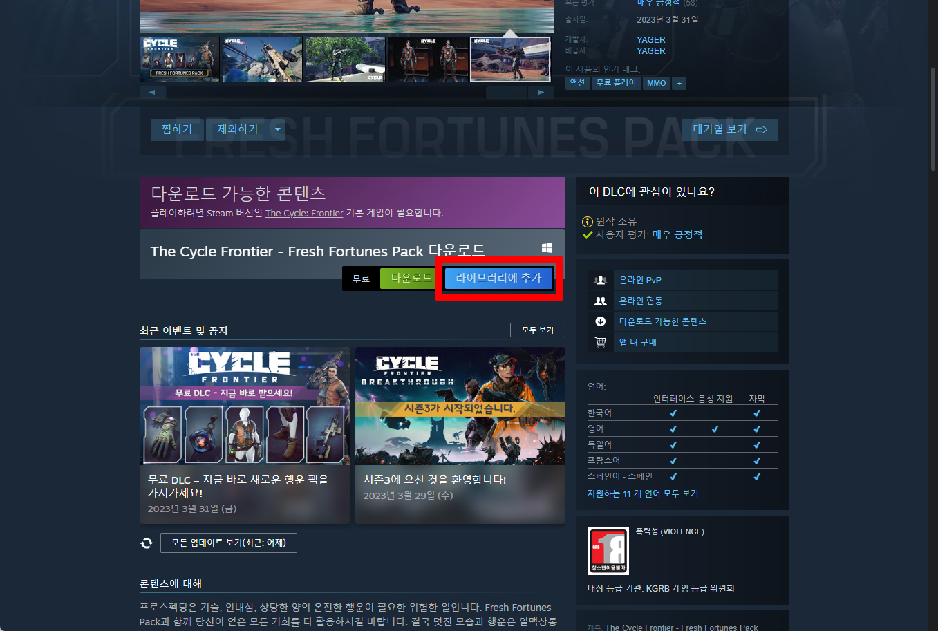 "The Cycle Frontier - Fresh Fortunes Pack" 게임페이지를 조금 내려준 후 [라이브러리에 추가] 버튼을 클릭하면 게임라이브러리에 추가됩니다.