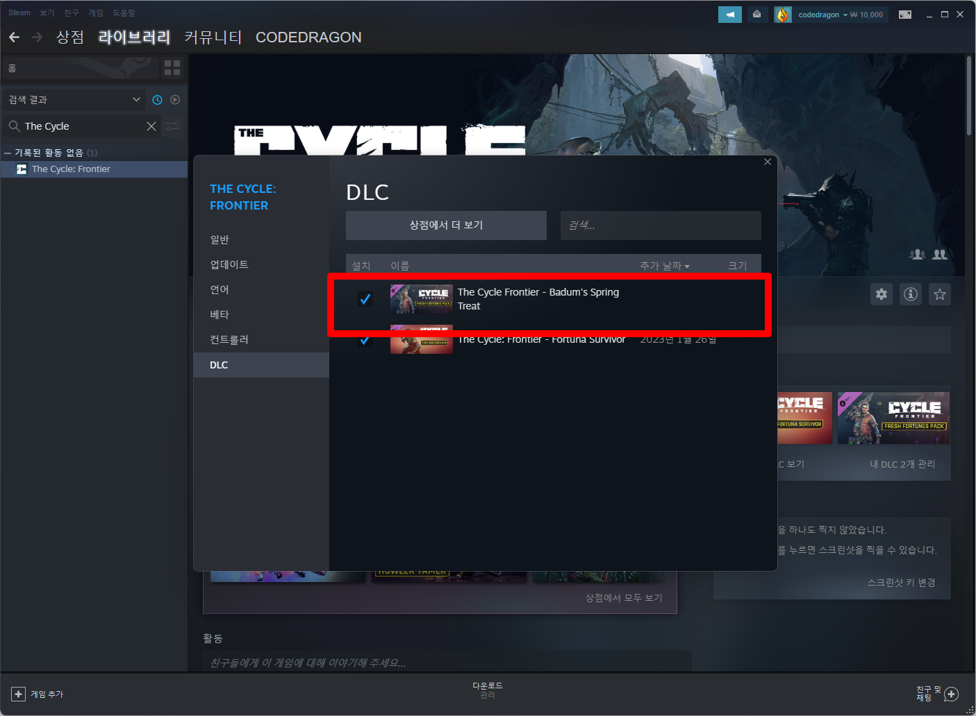 "The Cycle Frontier" 게임 항목 DLC관리에서 확인할 수 있습니다.