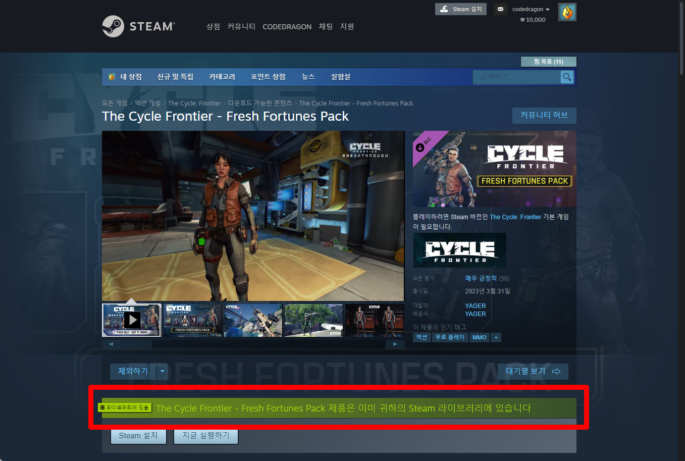 다시 "The Cycle Frontier - Fresh Fortunes Pack" 게임페이지로 돌아와 보면 녹색으로 표시되어 있어 게임라이브러리에 추가되었음을 확인할 수 있습니다.