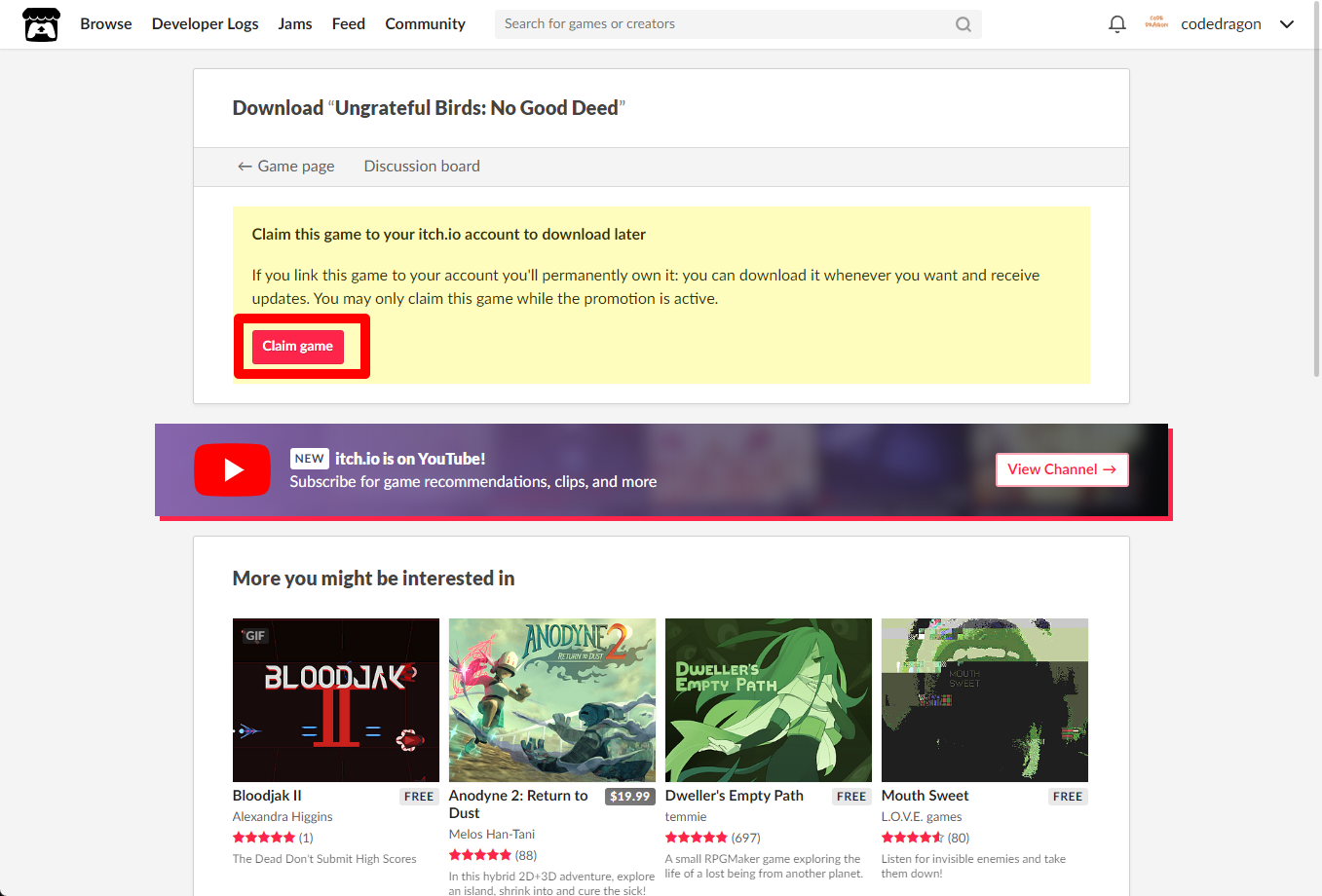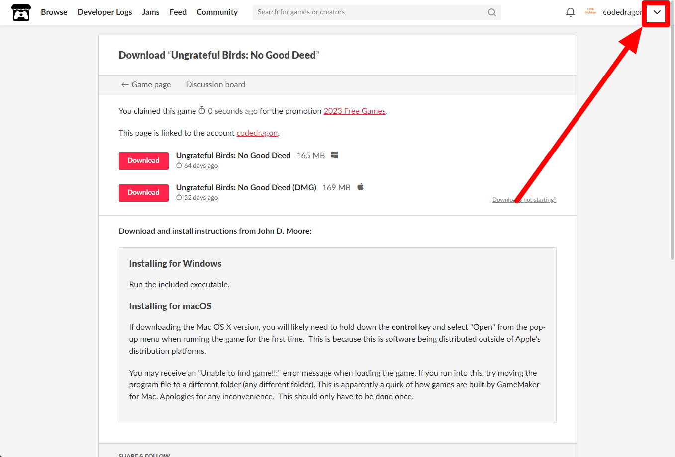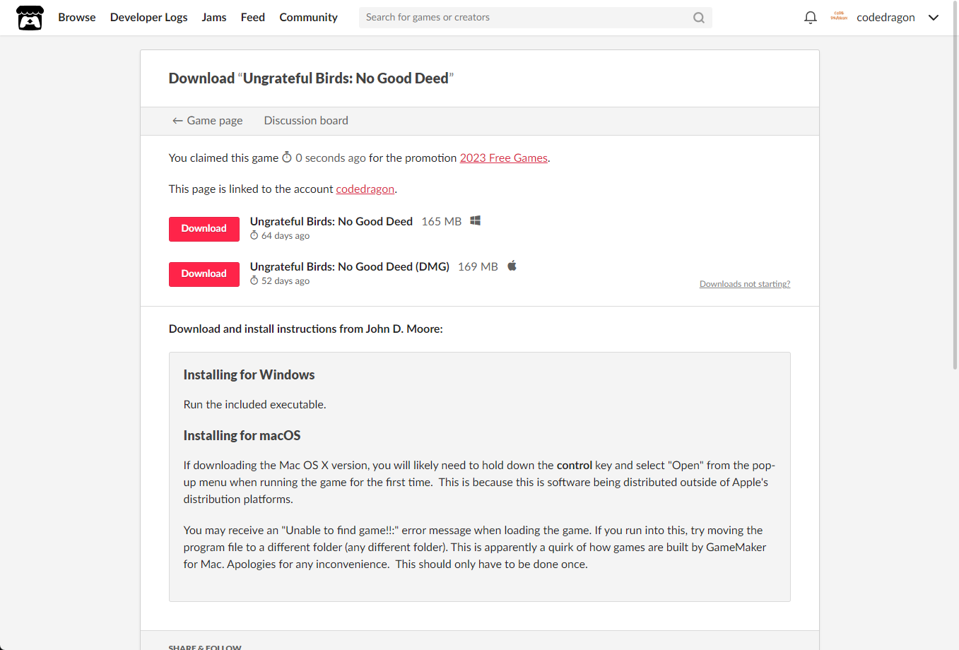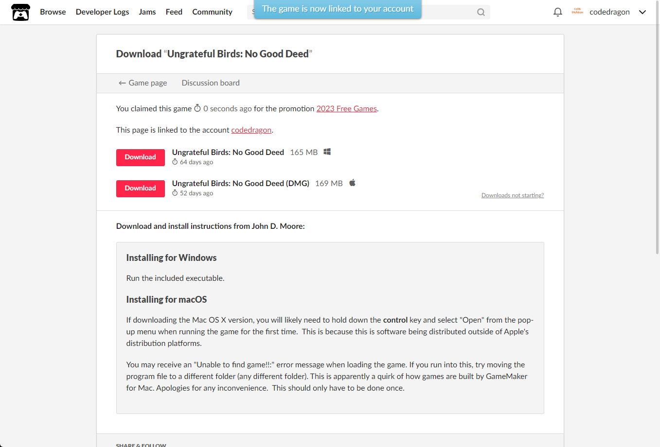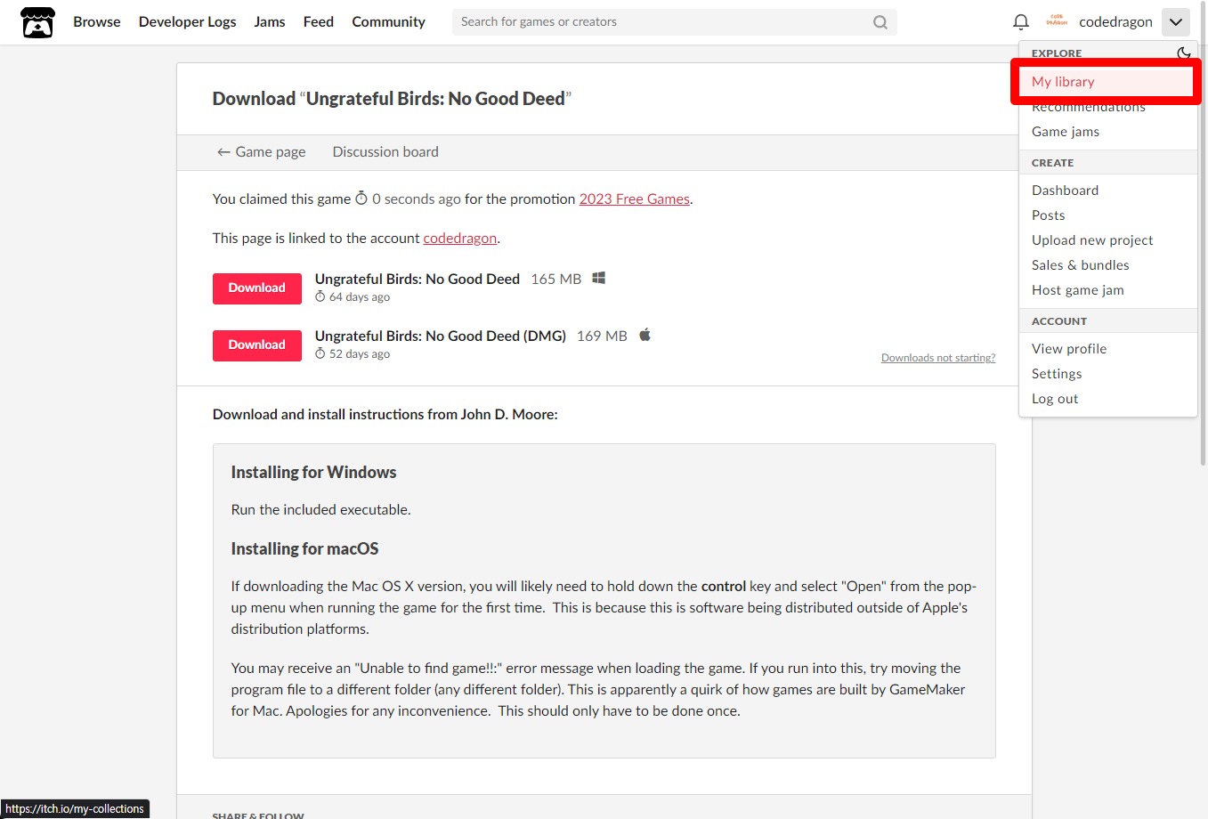 [Claim game]을 클릭하면 "Ungrateful Birds: No Good Deed" 게임이 나의 게임 라이브러리에 추가되고 설치파일을 다운받을 수 있는 페이지로 이동됩니다.