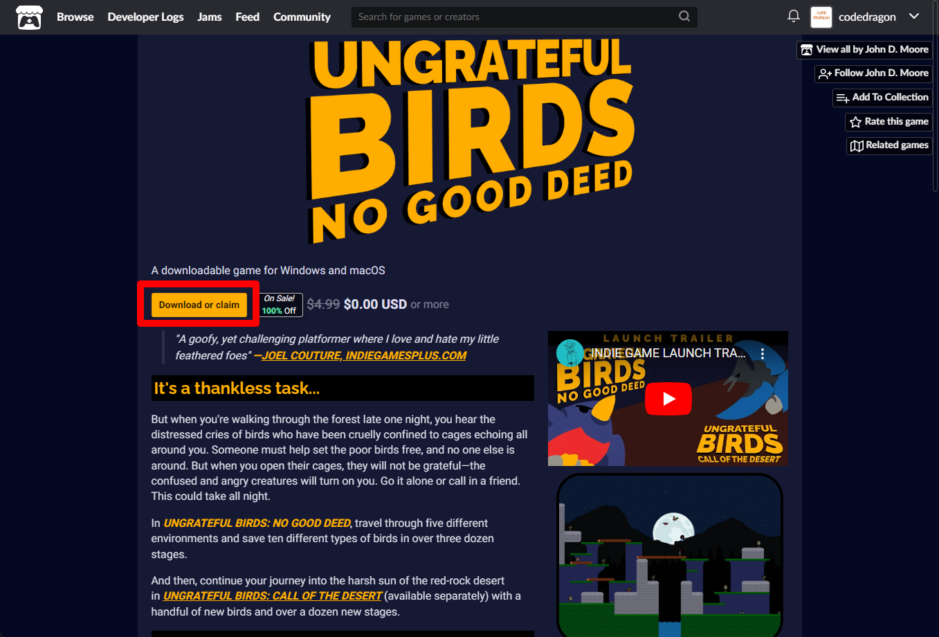 "Ungrateful Birds: No Good Deed" 페이지를 조금 내려 [Download Now]을 클릭합니다.