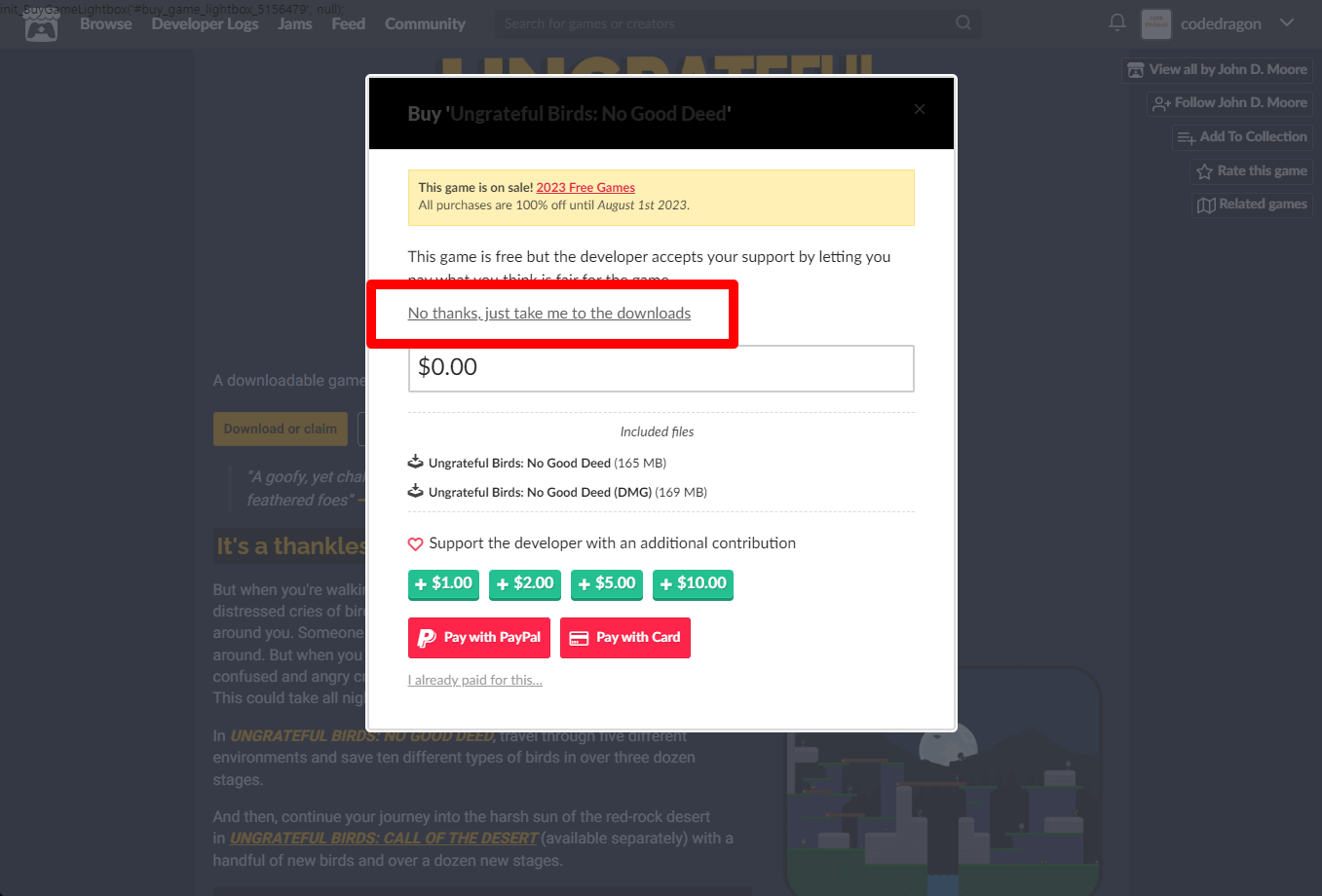 "Ungrateful Birds: No Good Deed" 구매 팝업창에서 [No thanks, just take me to the downloads] 링크를 클릭합니다.