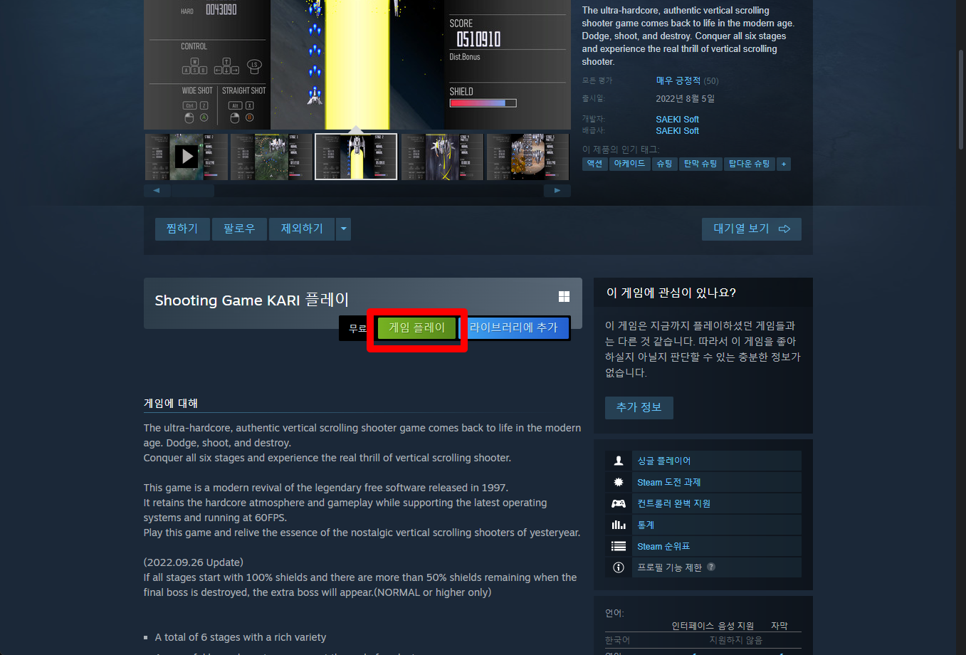 "Shooting Game KARI" 페이지를 내려 [게임 플레이]를 클릭하면 됩니다.