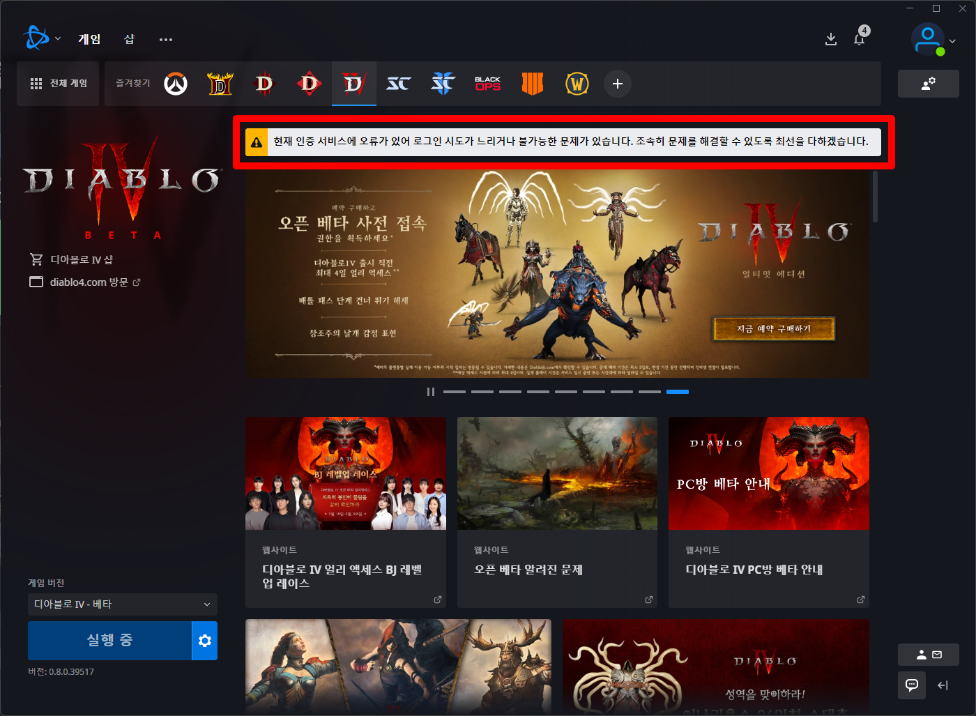 배틀넷 클라이언트에서 디아블로4 다시 실행