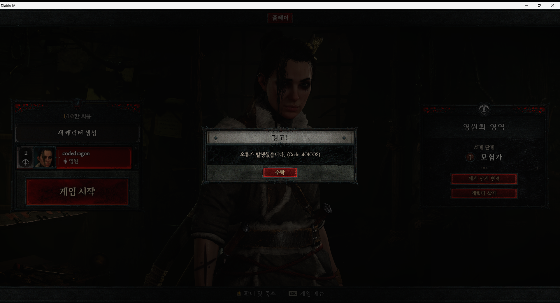 게임중 튕기거나 게인을 나온후 재접속시 오류(오류가 발생했습니다. Code 401003)가 발생한다면 다시 로그인이 되지 않습니다. 이경우 실행된 디아블로4를 종료하고 배틀넷 클라이언트에서 다시 실행하시기 바랍니다.