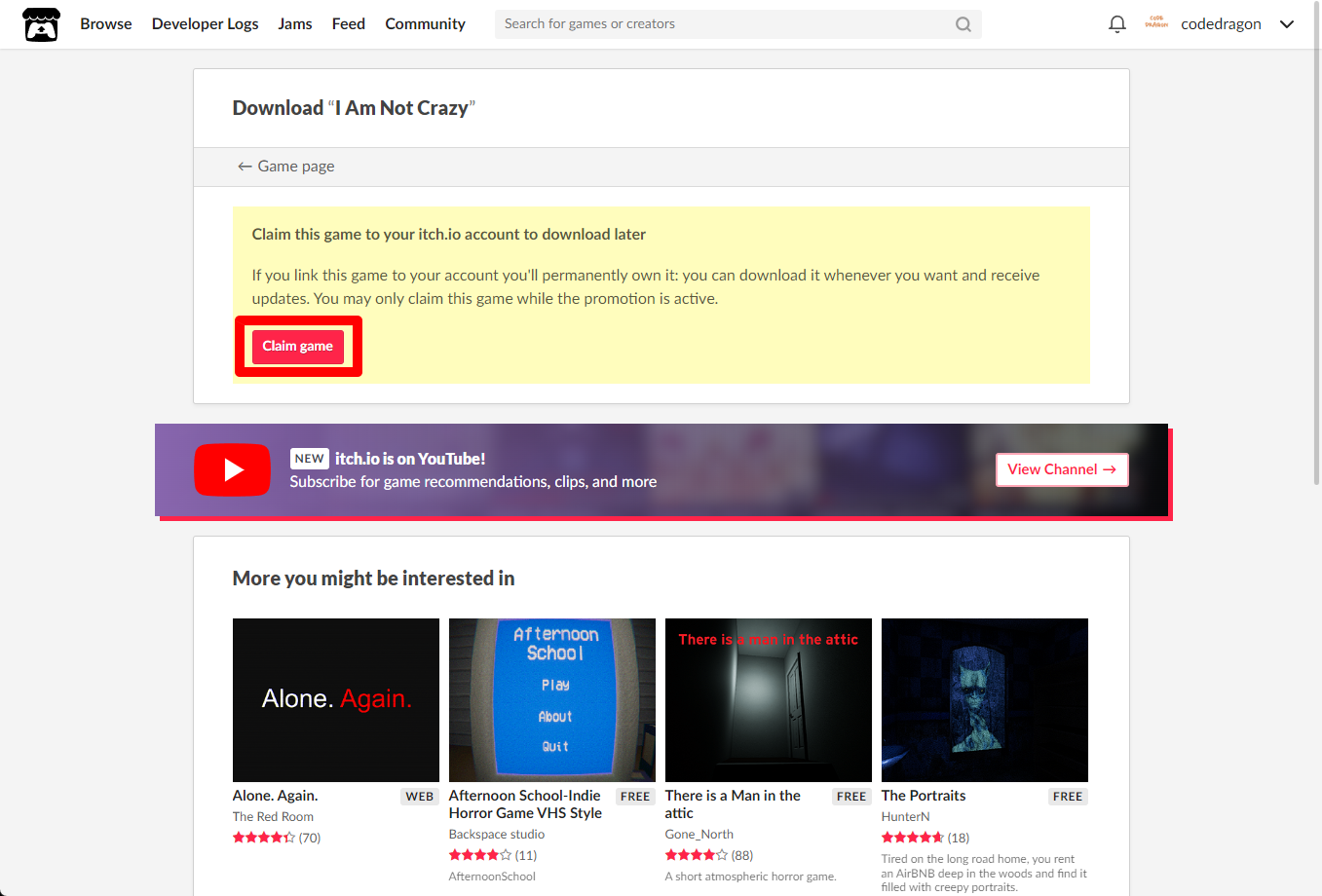 [Claim game]을 클릭하면 "I Am Not Crazy" 게임이 나의 게임 라이브러리에 추가되고 설치파일을 다운받을 수 있는 페이지로 이동됩니다.