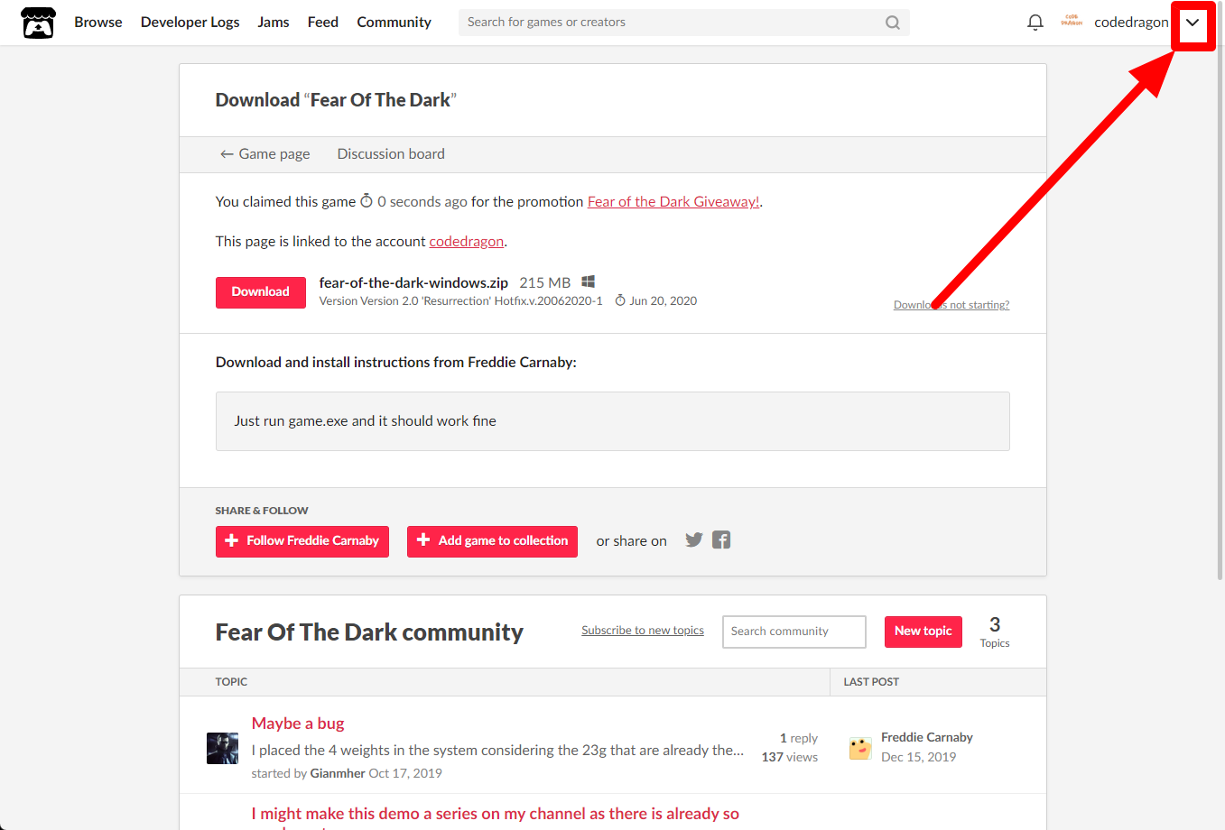 itch.io에서 받은 "Fear Of The Dark" 게임 확인하고 설치파일 다운받아 보겠습니다. 우측 상단의 나의 사용자명 오른쪽의 화살표 아이콘을 클릭합니다.