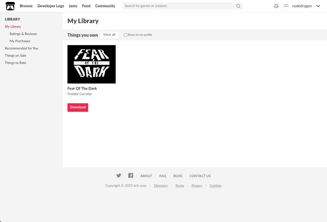 "My Lirary"에서 방금 받은 "Fear Of The Dark" 게임 항목을 확인할 수 있습니다.