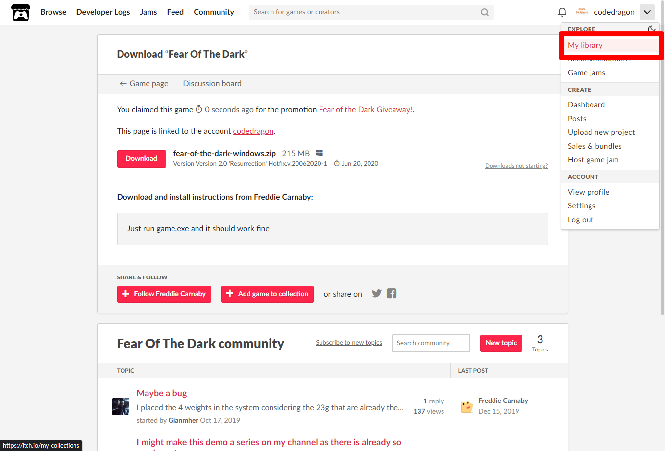 [Claim game]을 클릭하면 "Fear Of The Dark" 게임이 나의 게임 라이브러리에 추가되고 설치파일을 다운받을 수 있는 페이지로 이동됩니다.