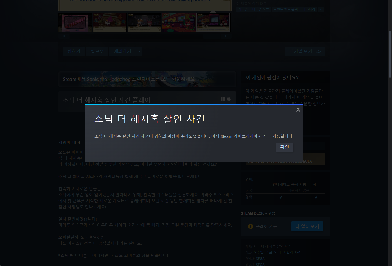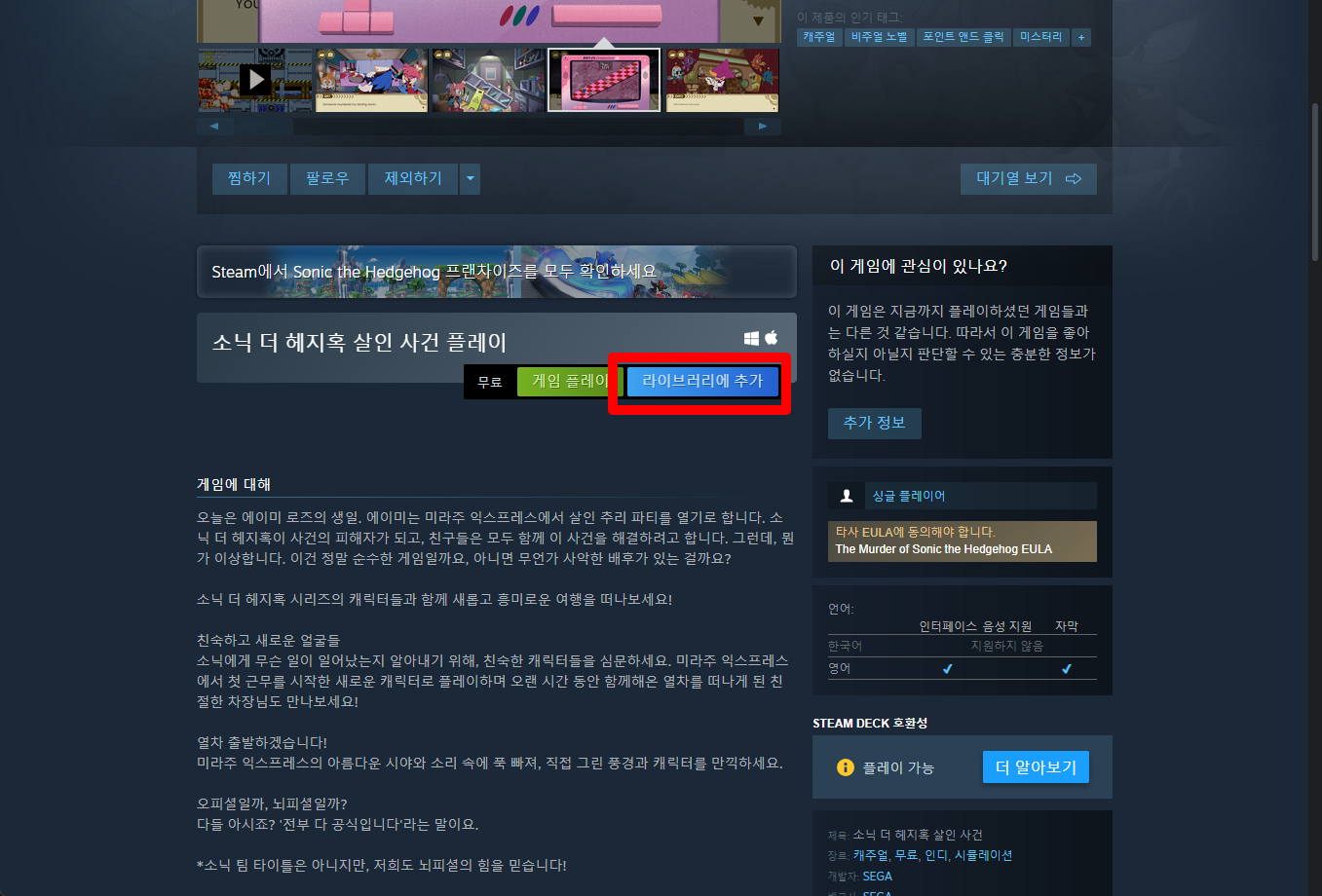 "The Murder of Sonic the Hedgehog" 페이지를 내려 [라이브러리에 추가]를 클릭하면 됩니다.