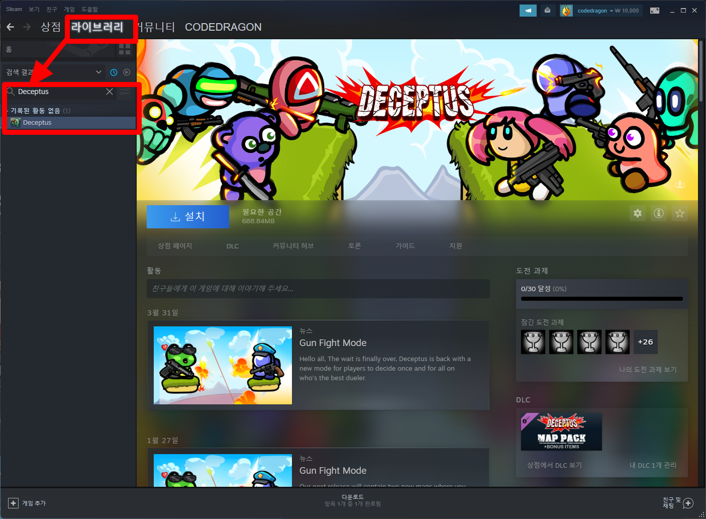 스팀런처에서 상단에 있는 [라이브러리] 메뉴를 통해 방금 받은 "Deceptus" 게임을 확인할 수 있습니다.