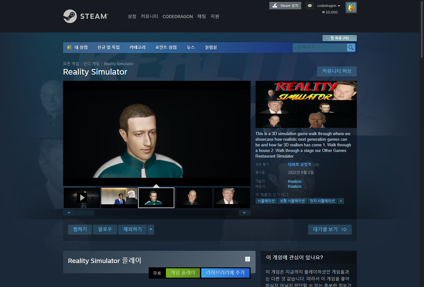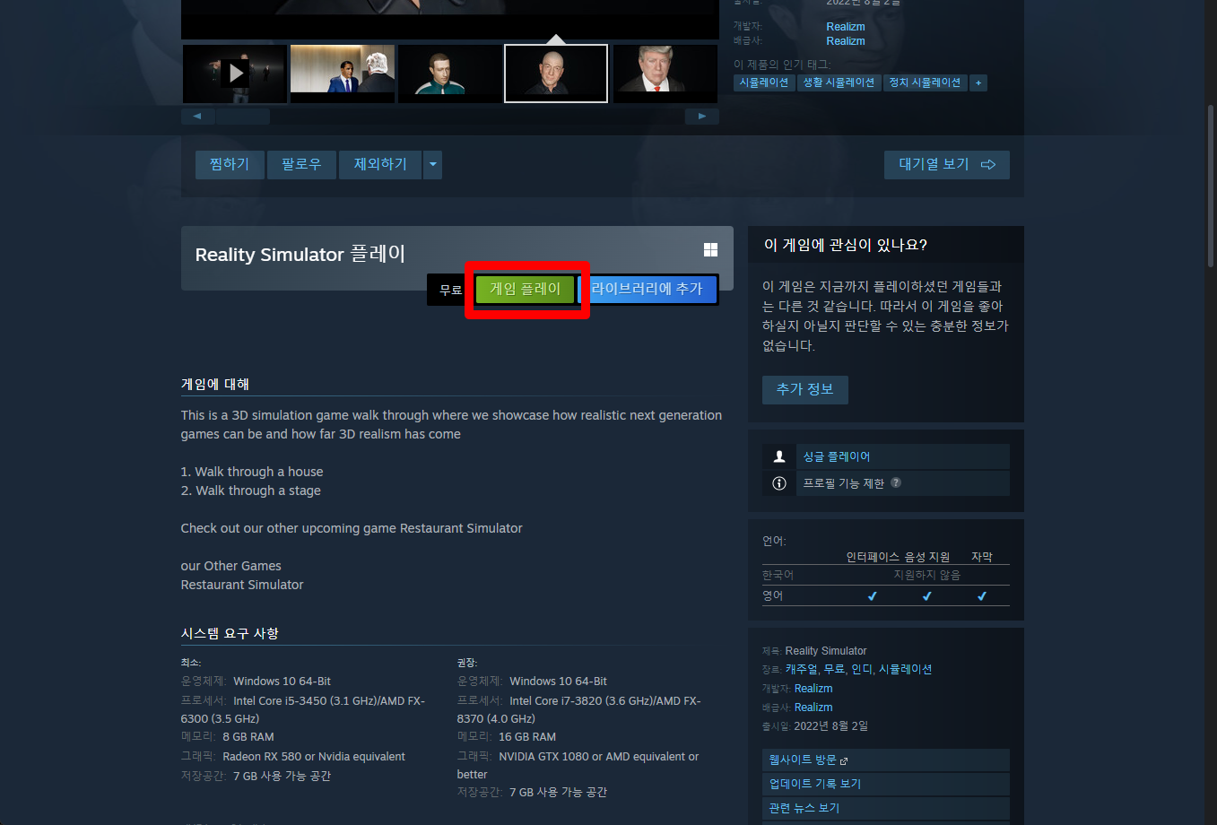 "Reality Simulator" 페이지를 내려 [게임 플레이]를 클릭하면 됩니다.