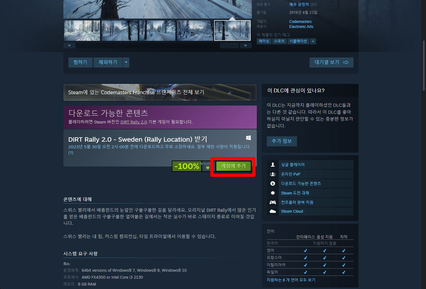 "DiRT Rally 2.0 - Sweden (Rally Location)" 게임페이지를 조금 내려준 후 [계정에 추가] 버튼을 클릭하면 게임라이브러리에 추가됩니다.