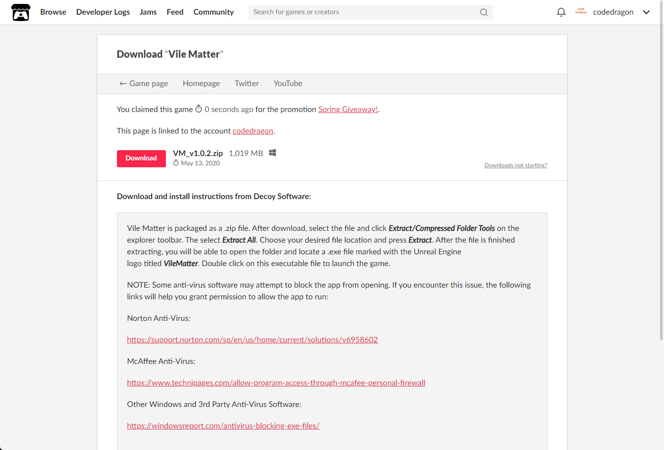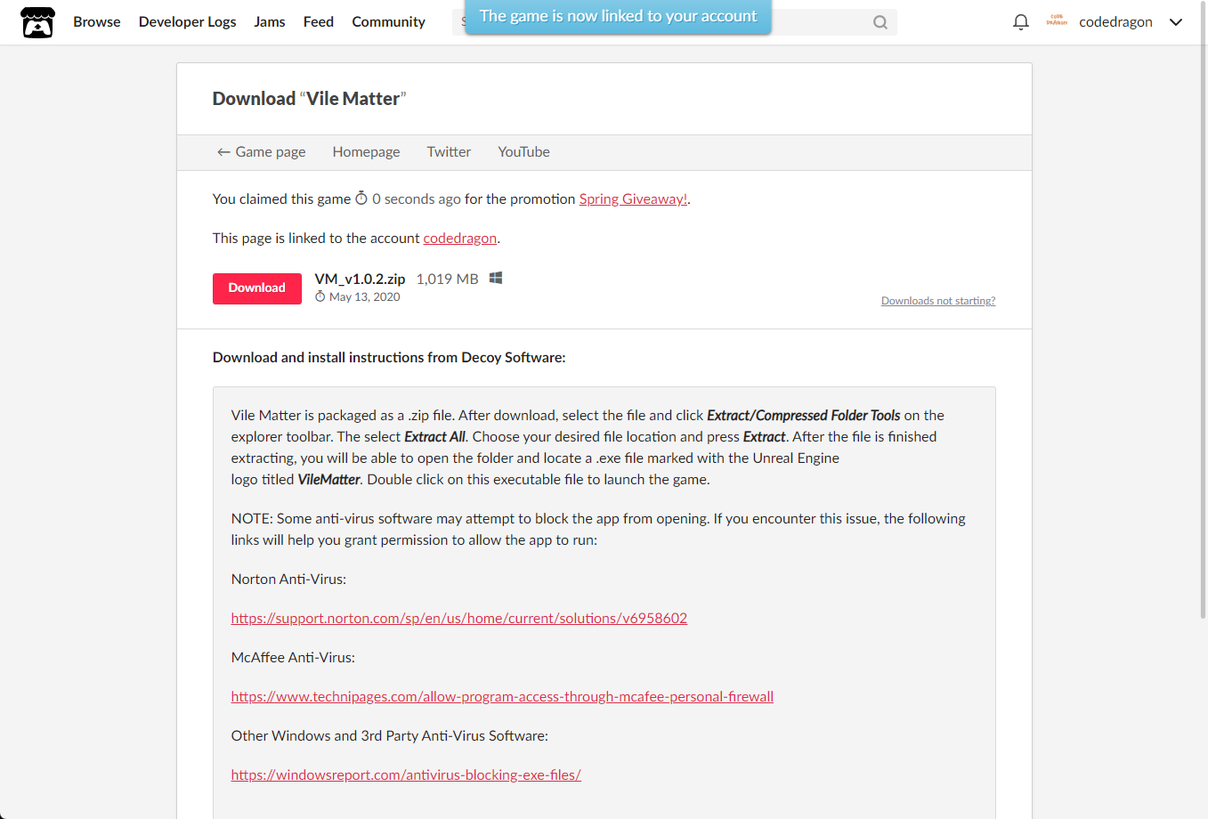 [Claim game]을 클릭하면 "Vile Matter" 게임이 나의 게임 라이브러리에 추가되고 설치파일을 다운받을 수 있는 페이지로 이동됩니다.