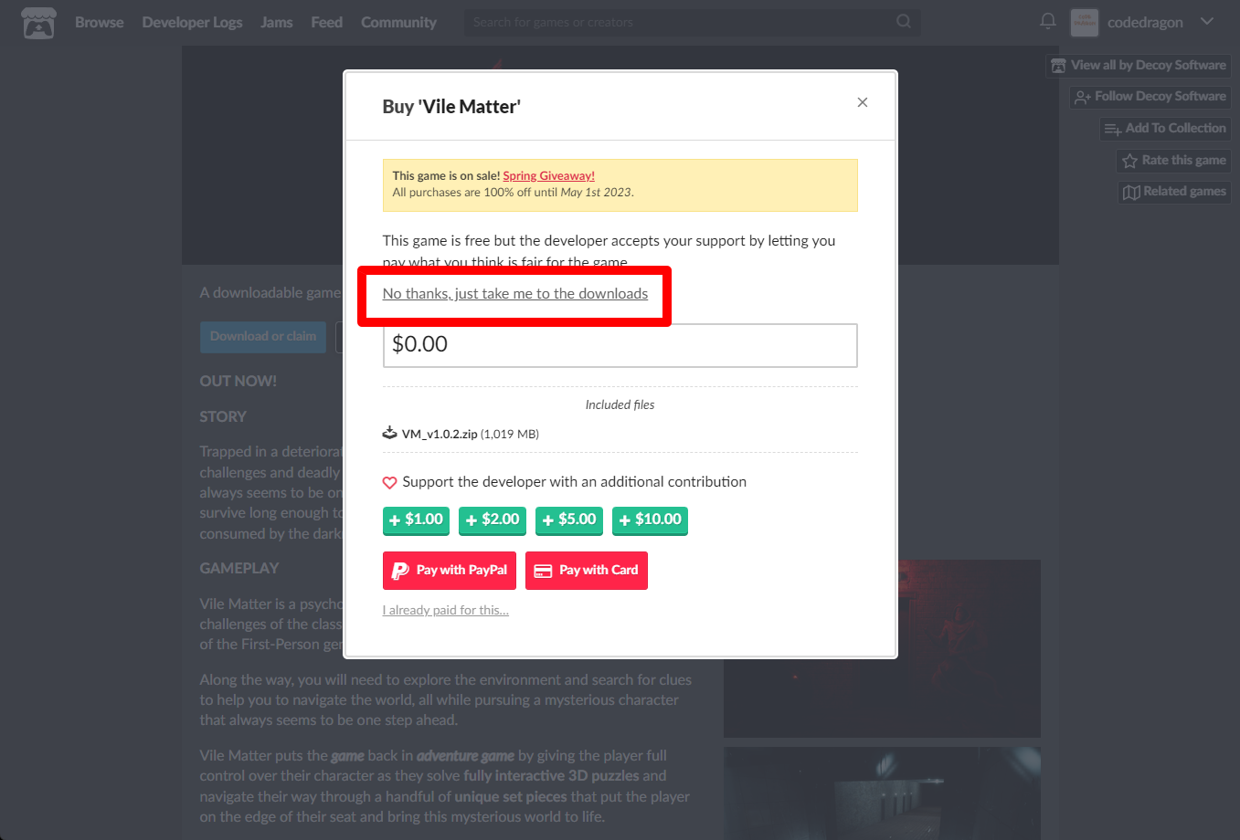 "Vile Matter" 구매창에서 [No thanks, just take me to the downloads] 링크를 클릭합니다.