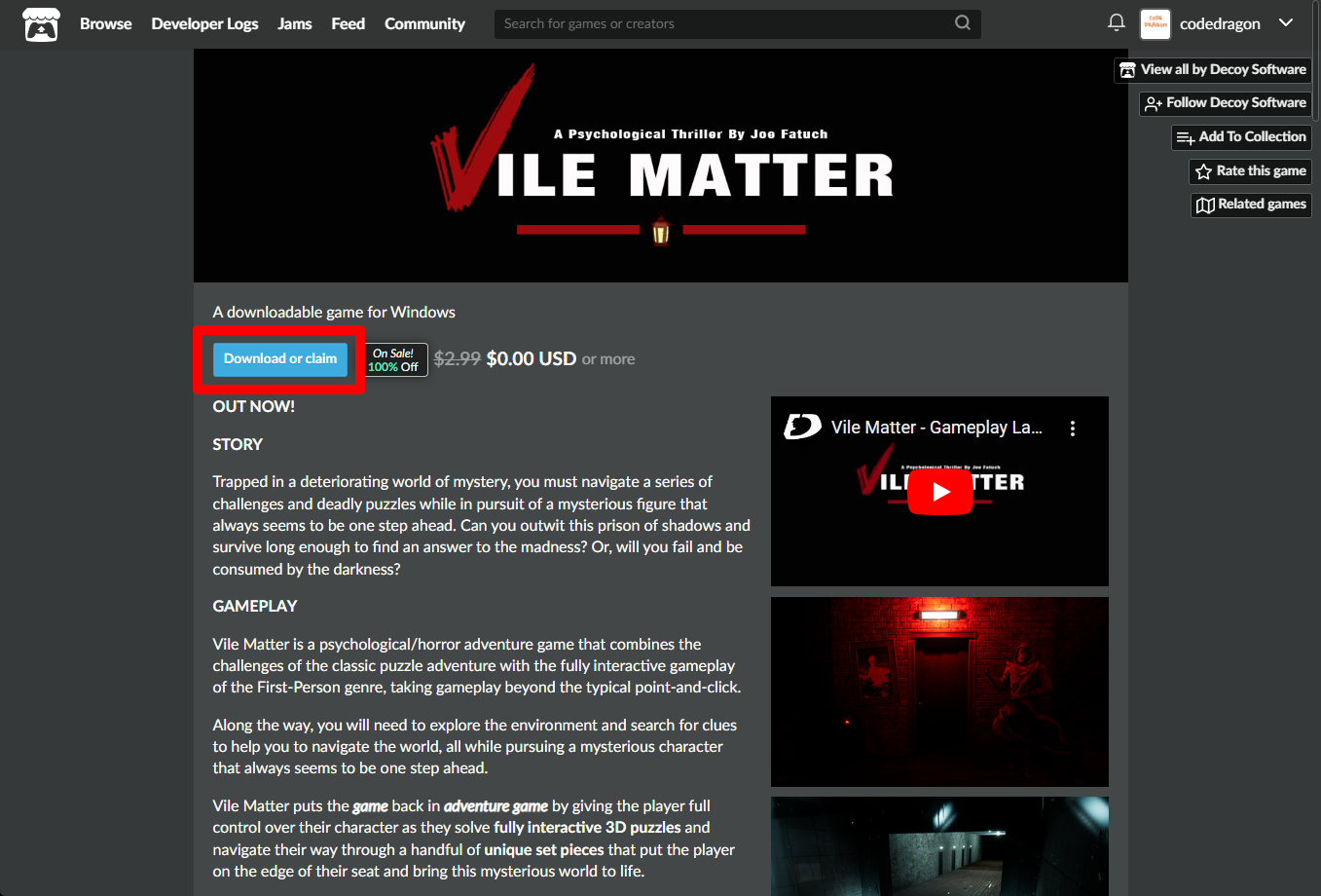 "Vile Matter" 페이지에 있는 [Download or claim]을 클릭합니다.
