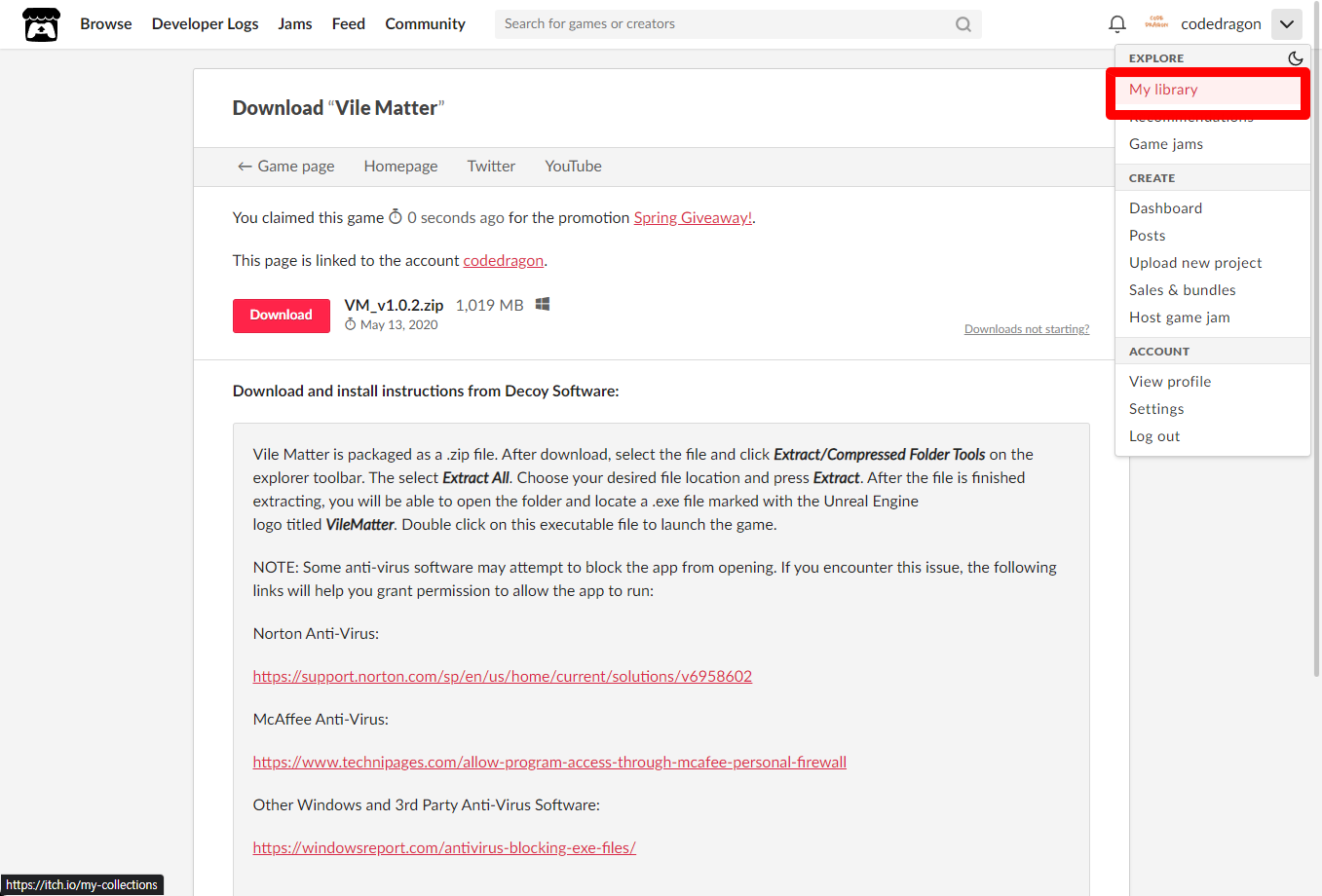 [Claim game]을 클릭하면 "Vile Matter" 게임이 나의 게임 라이브러리에 추가되고 설치파일을 다운받을 수 있는 페이지로 이동됩니다.