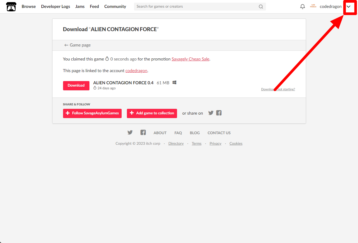 itch.io에서 받은 "ALIEN CONTAGION FORCE" 게임 확인하고 설치파일 다운받아 보겠습니다. 우측 상단의 나의 사용자명 오른쪽의 화살표 아이콘을 클릭합니다.