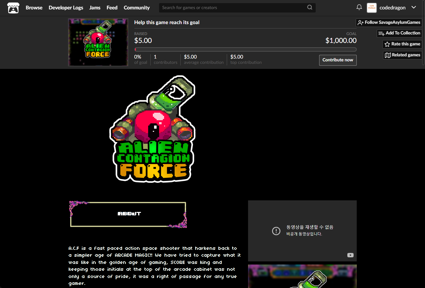 "ALIEN CONTAGION FORCE" 해당 항목에 있는 [Download] 버튼을 클릭하면 게임의 설치파일을 다운받을 수 있습니다.