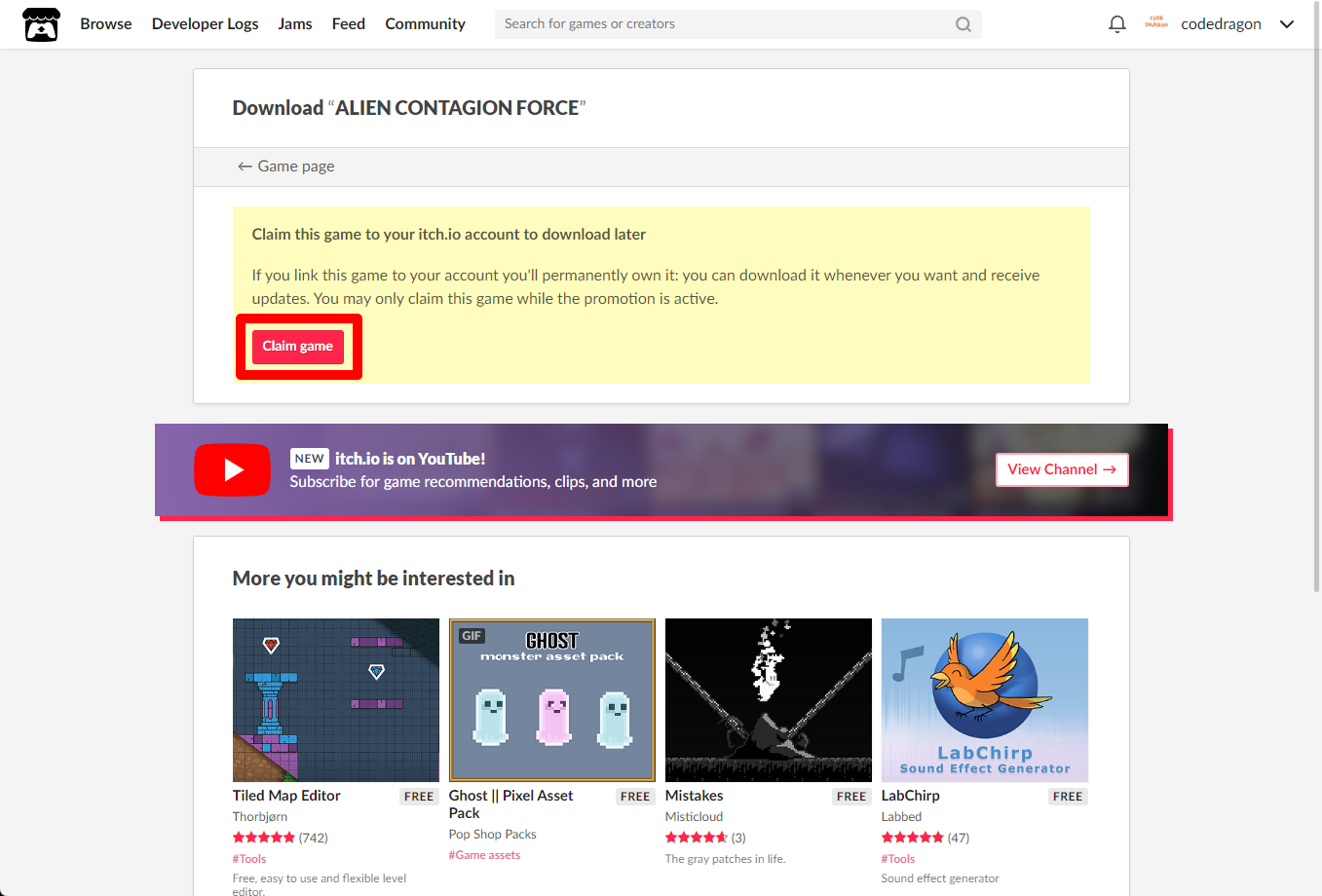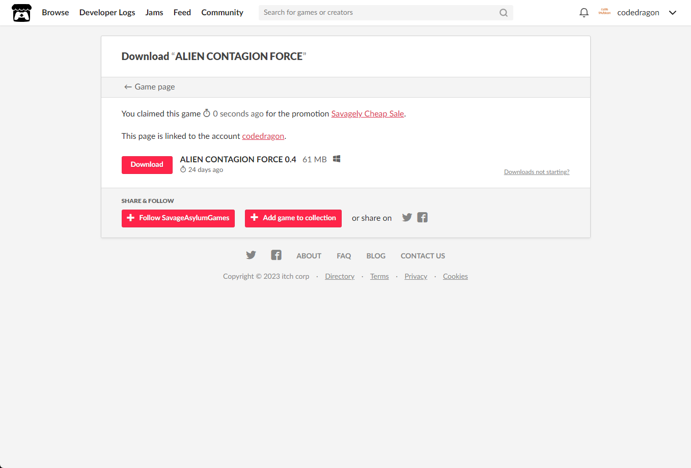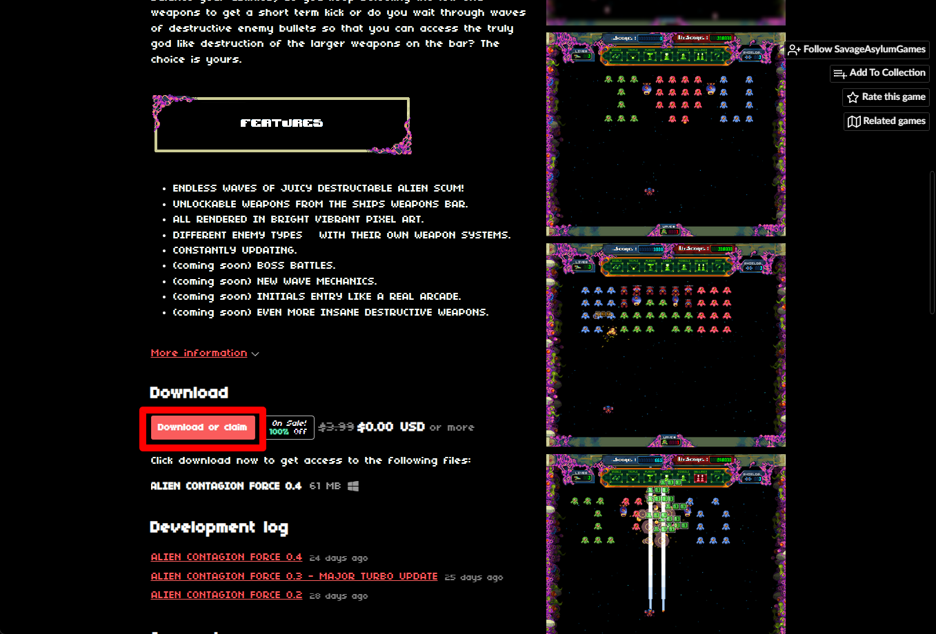 "ALIEN CONTAGION FORCE" 페이지에 있는 [Download or claim]을 클릭합니다.