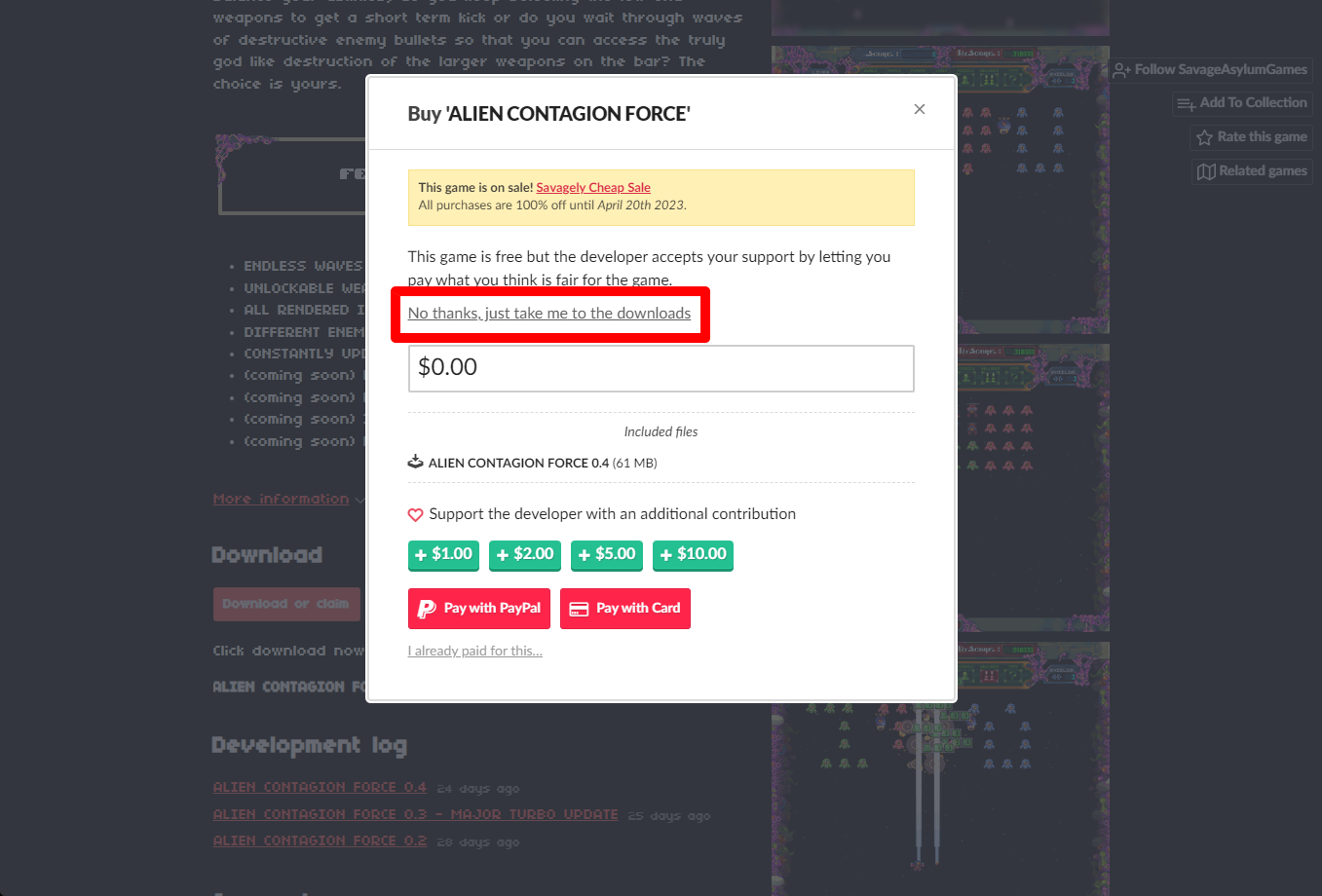 "ALIEN CONTAGION FORCE" 구매창에서 [No thanks, just take me to the downloads] 링크를 클릭합니다.