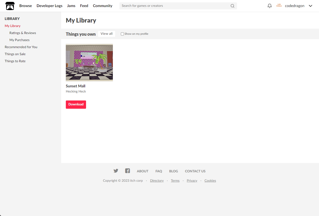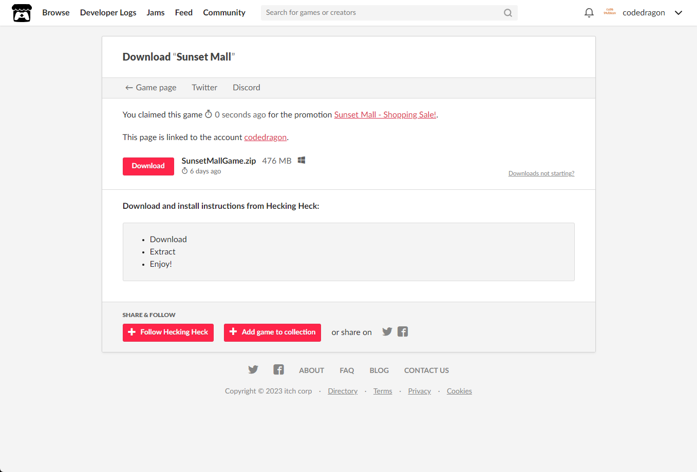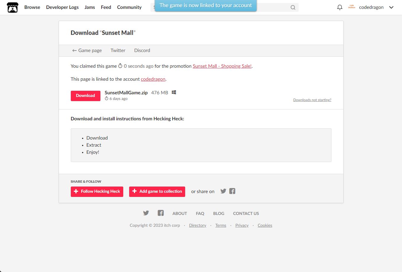 [Claim game]을 클릭하면 "Sunset Mall" 게임이 나의 게임 라이브러리에 추가되고 설치파일을 다운받을 수 있는 페이지로 이동됩니다.