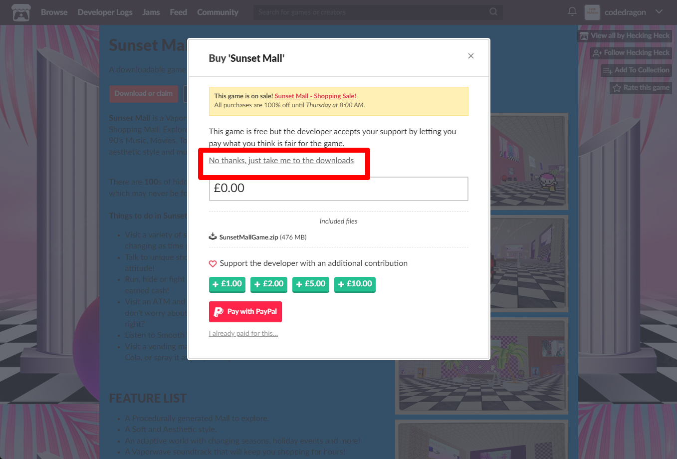 "Sunset Mall" 구매창에서 [No thanks, just take me to the downloads] 링크를 클릭합니다.