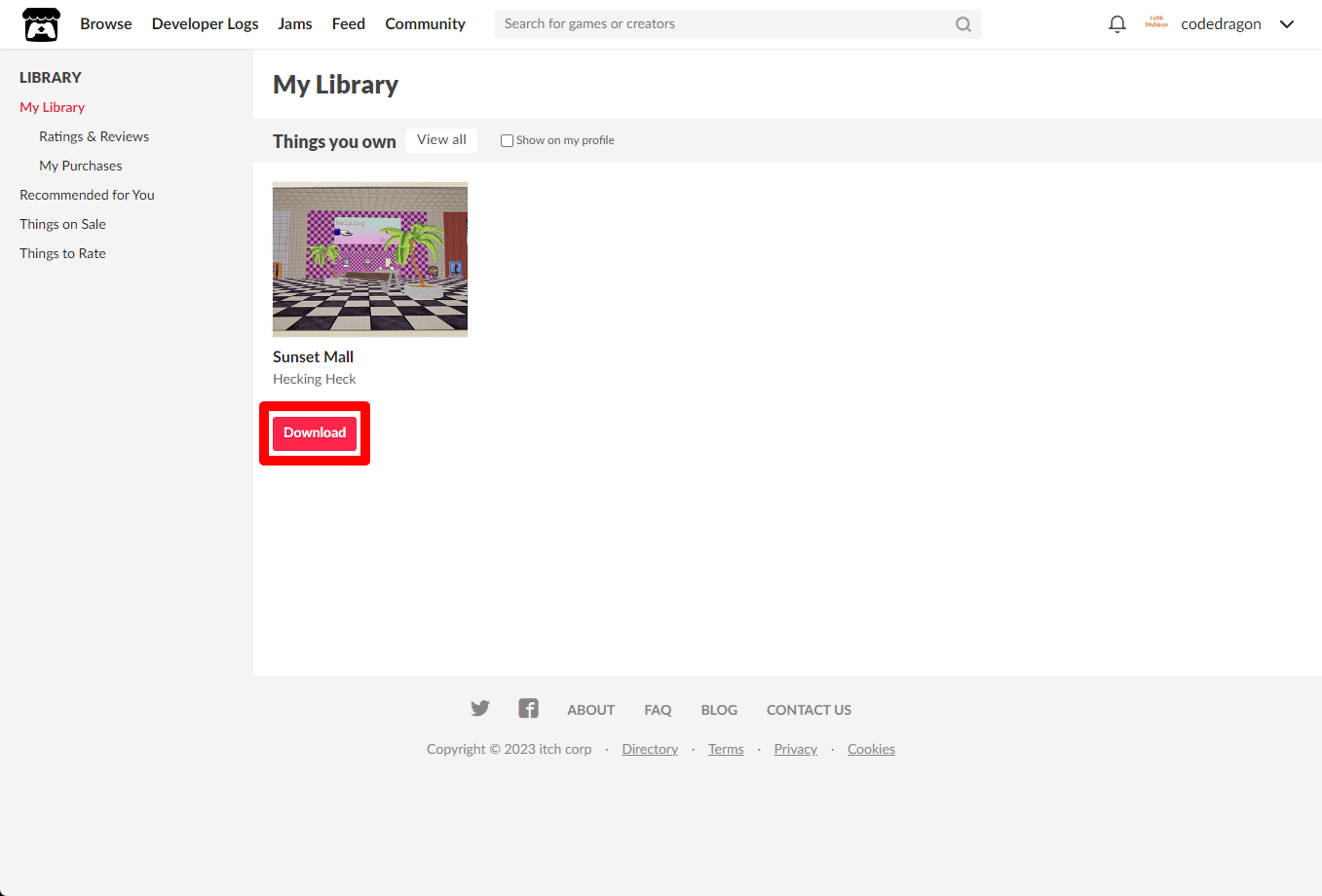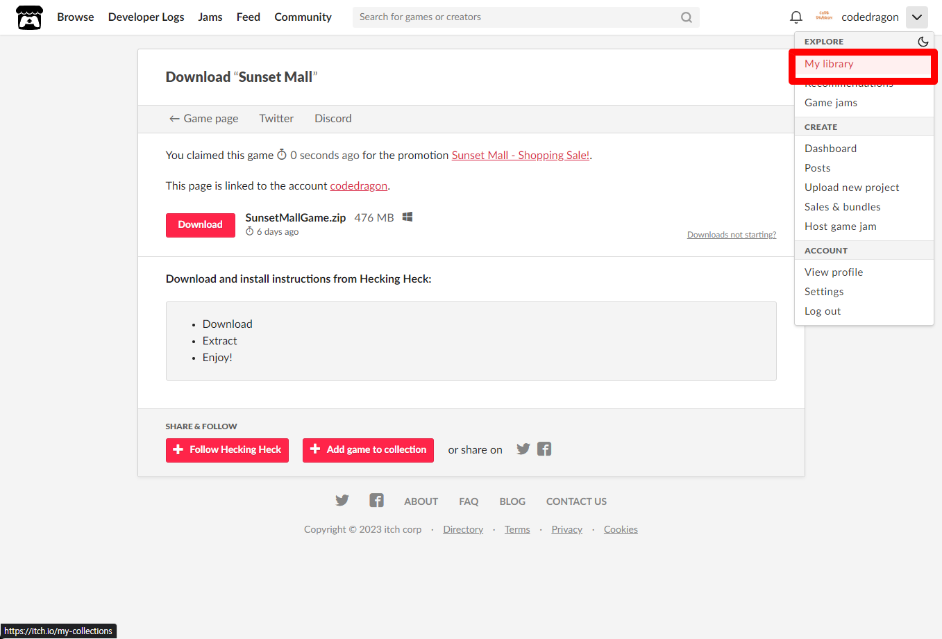 itch.io에서 받은 "Sunset Mall" 게임 확인하고 설치파일 다운받아 보겠습니다. 우측 상단의 나의 사용자명 오른쪽의 화살표 아이콘을 클릭합니다.