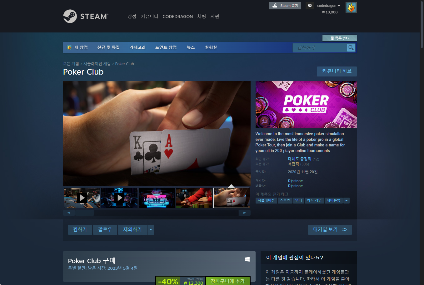 ₩20,500 -> ₩0(FREE) Poker Club 포커 클럽 무료로 받기 영구소장; 에픽 게임즈 epic games EGS 한시적 무료 Get free copy