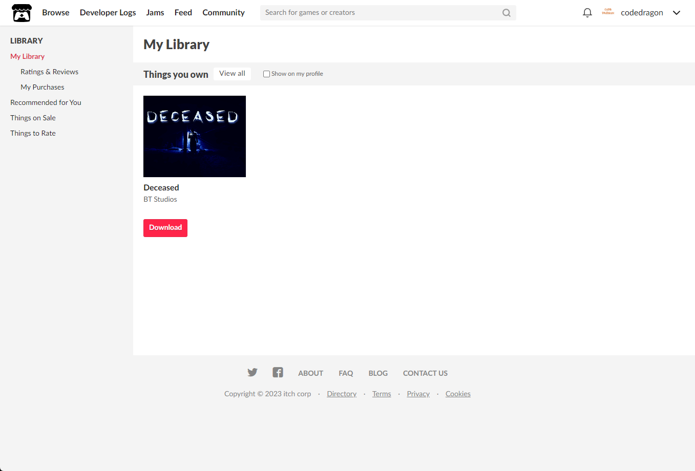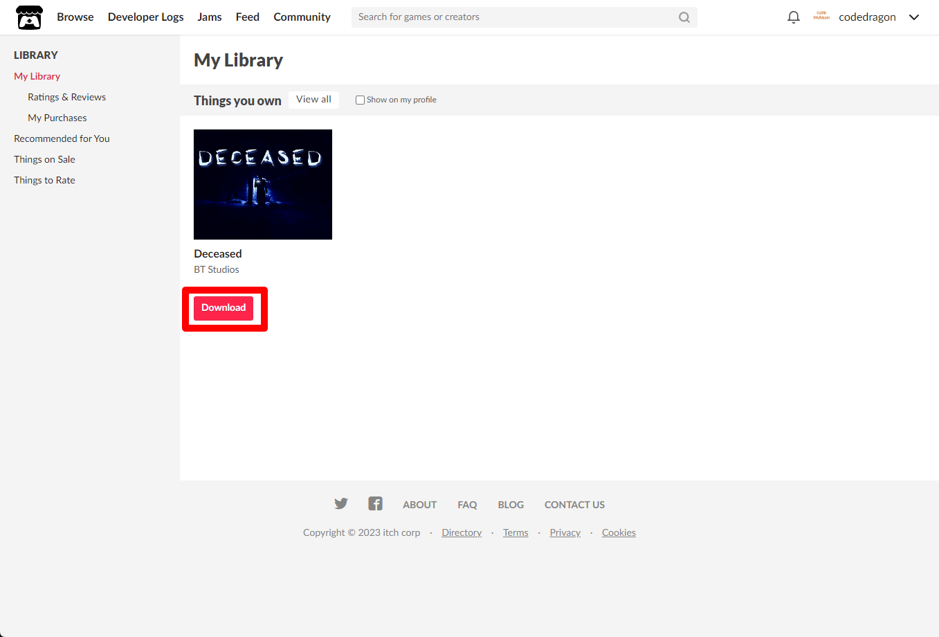 "My Lirary"에서 방금 받은 "Deceased" 게임 항목을 확인할 수 있습니다.
