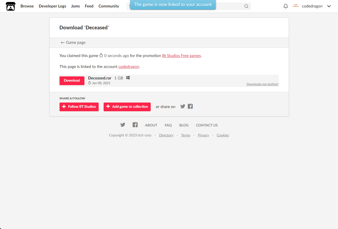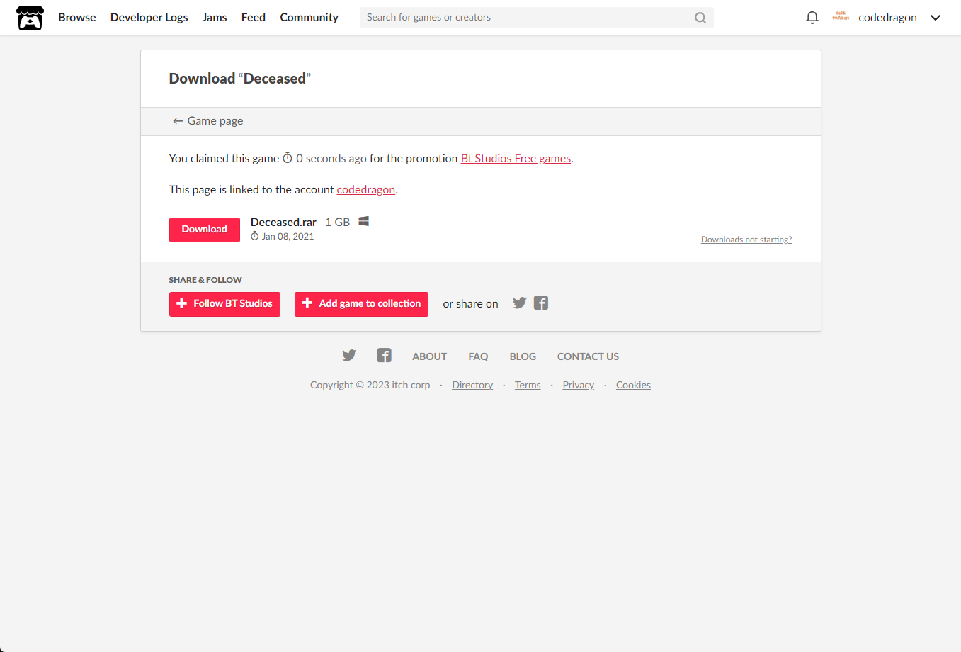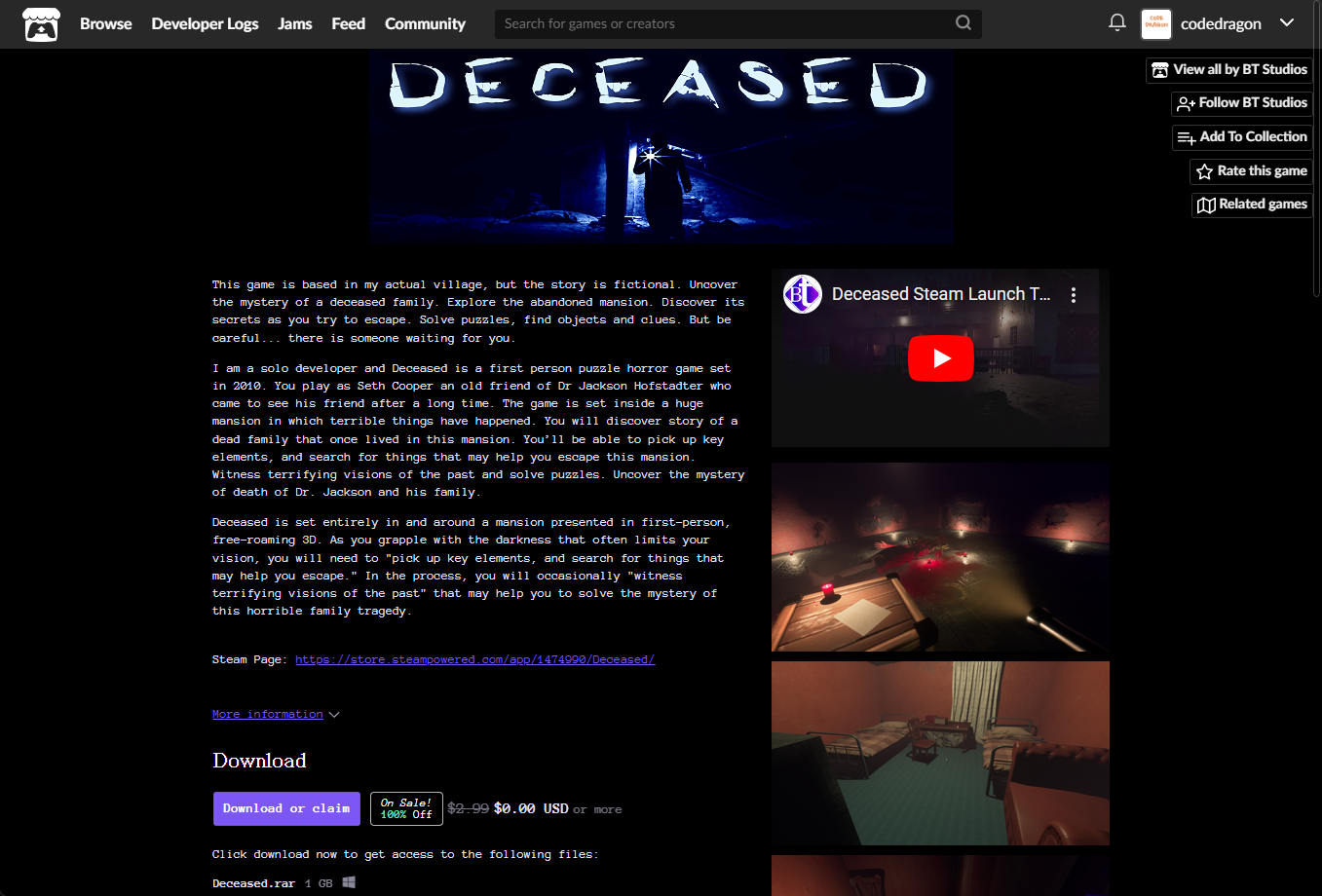 [Claim game]을 클릭하면 "Deceased" 게임이 나의 게임 라이브러리에 추가되고 설치파일을 다운받을 수 있는 페이지로 이동됩니다.