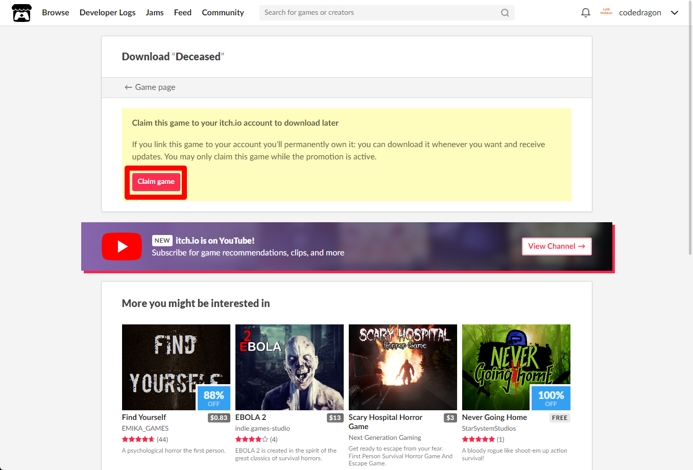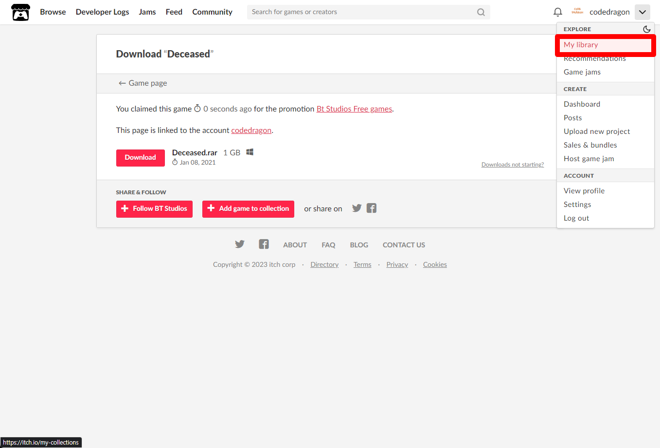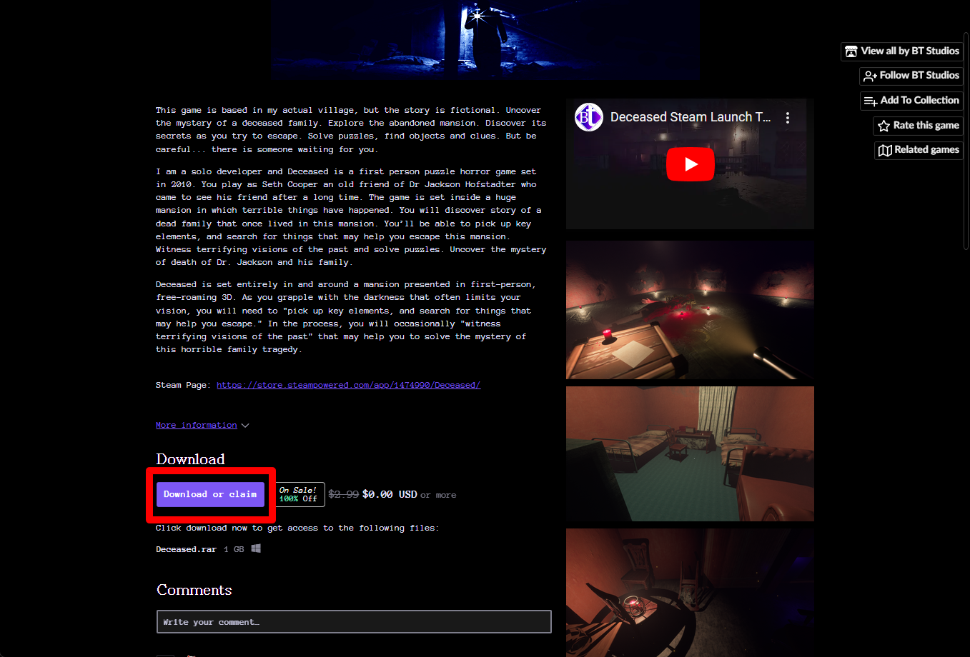 [Claim game]을 클릭하면 "Deceased" 게임이 나의 게임 라이브러리에 추가되고 설치파일을 다운받을 수 있는 페이지로 이동됩니다.