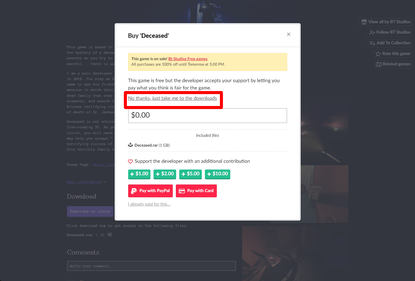 "Deceased" 구매창에서 [No thanks, just take me to the downloads] 링크를 클릭합니다.
