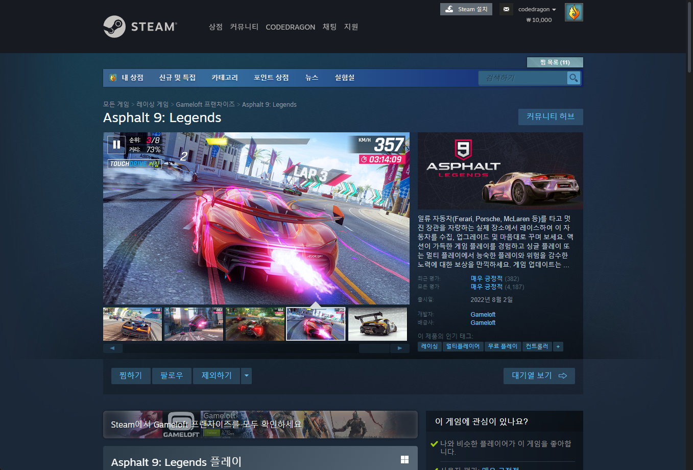 "Asphalt 9: Legends" 스팀 페이지 입니다.