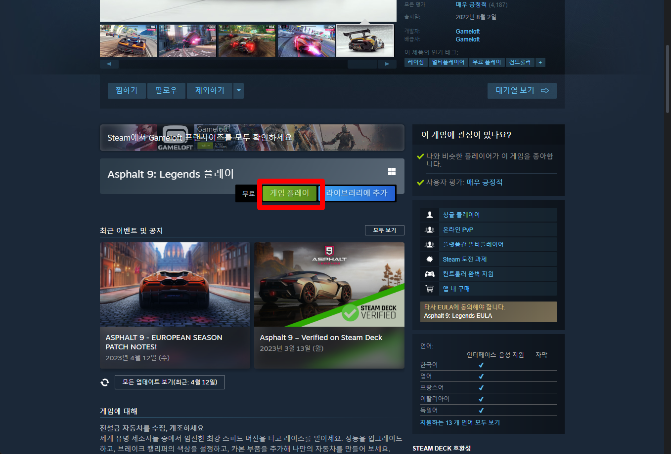 "Asphalt 9: Legends" 페이지를 내려 [게임 플레이]를 클릭하면 됩니다.