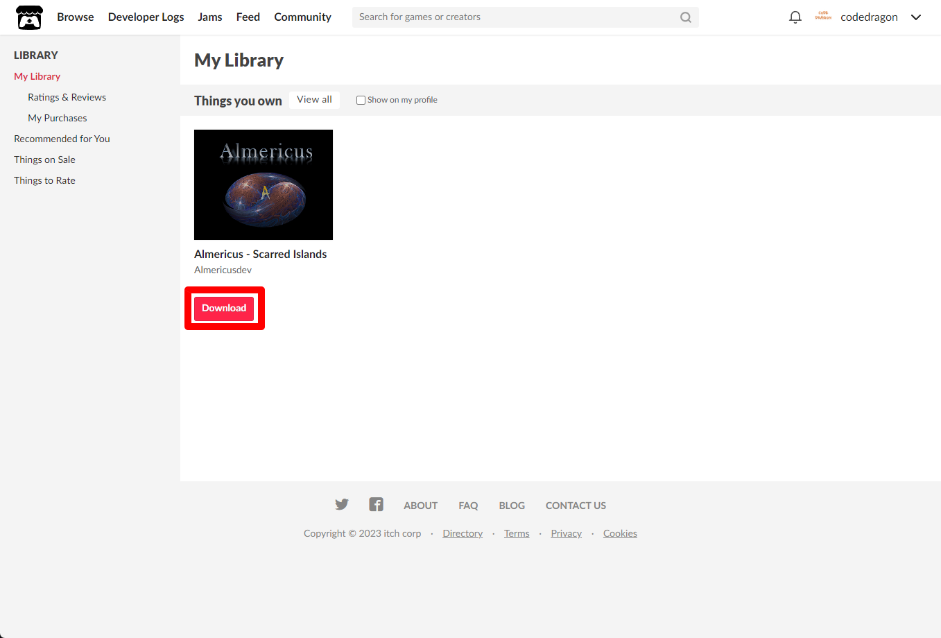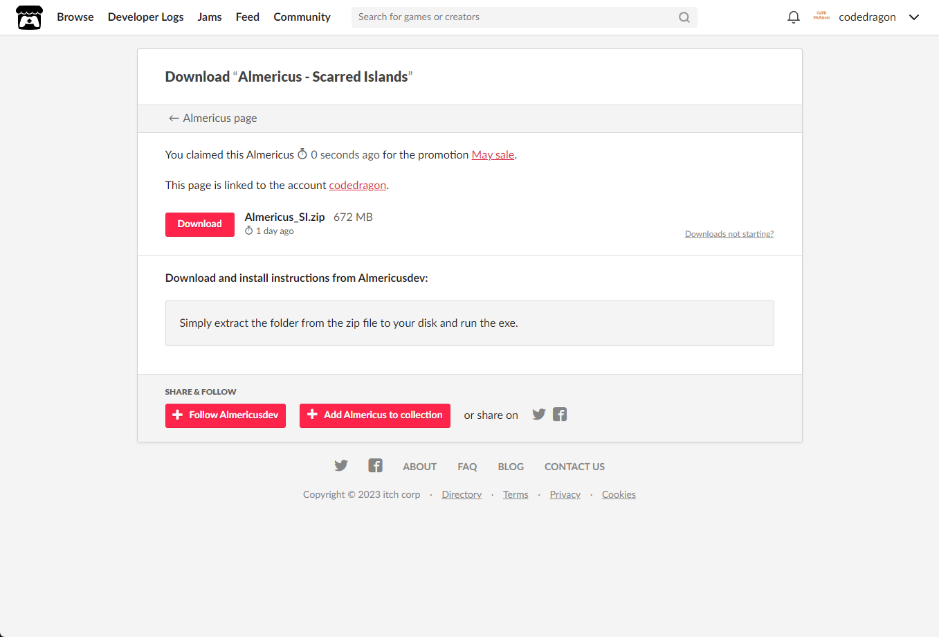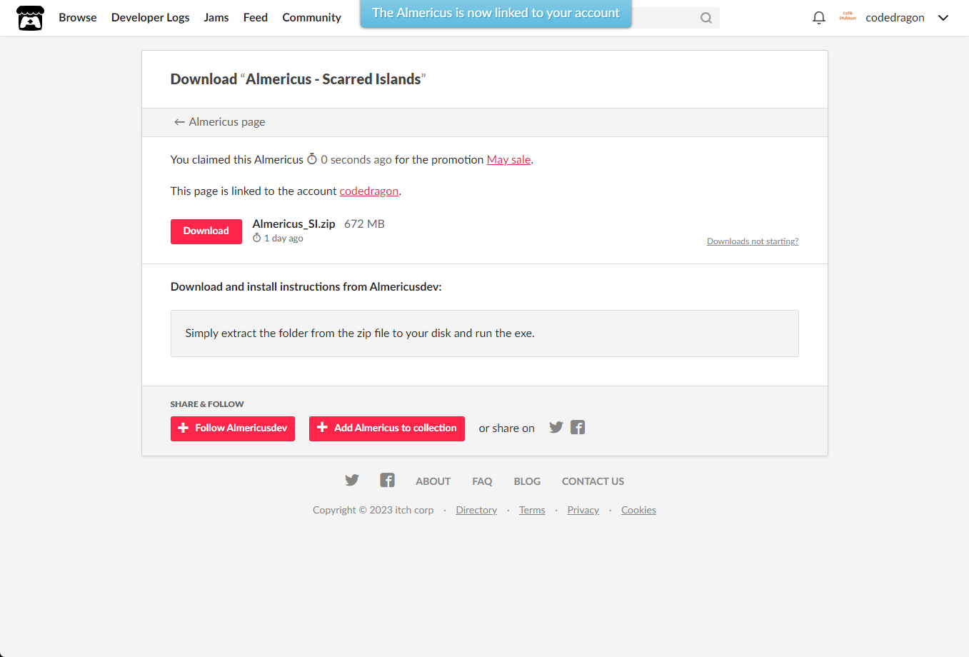 [Claim game]을 클릭하면 "Almericus - Scarred Islands" 게임이 나의 게임 라이브러리에 추가되고 설치파일을 다운받을 수 있는 페이지로 이동됩니다.