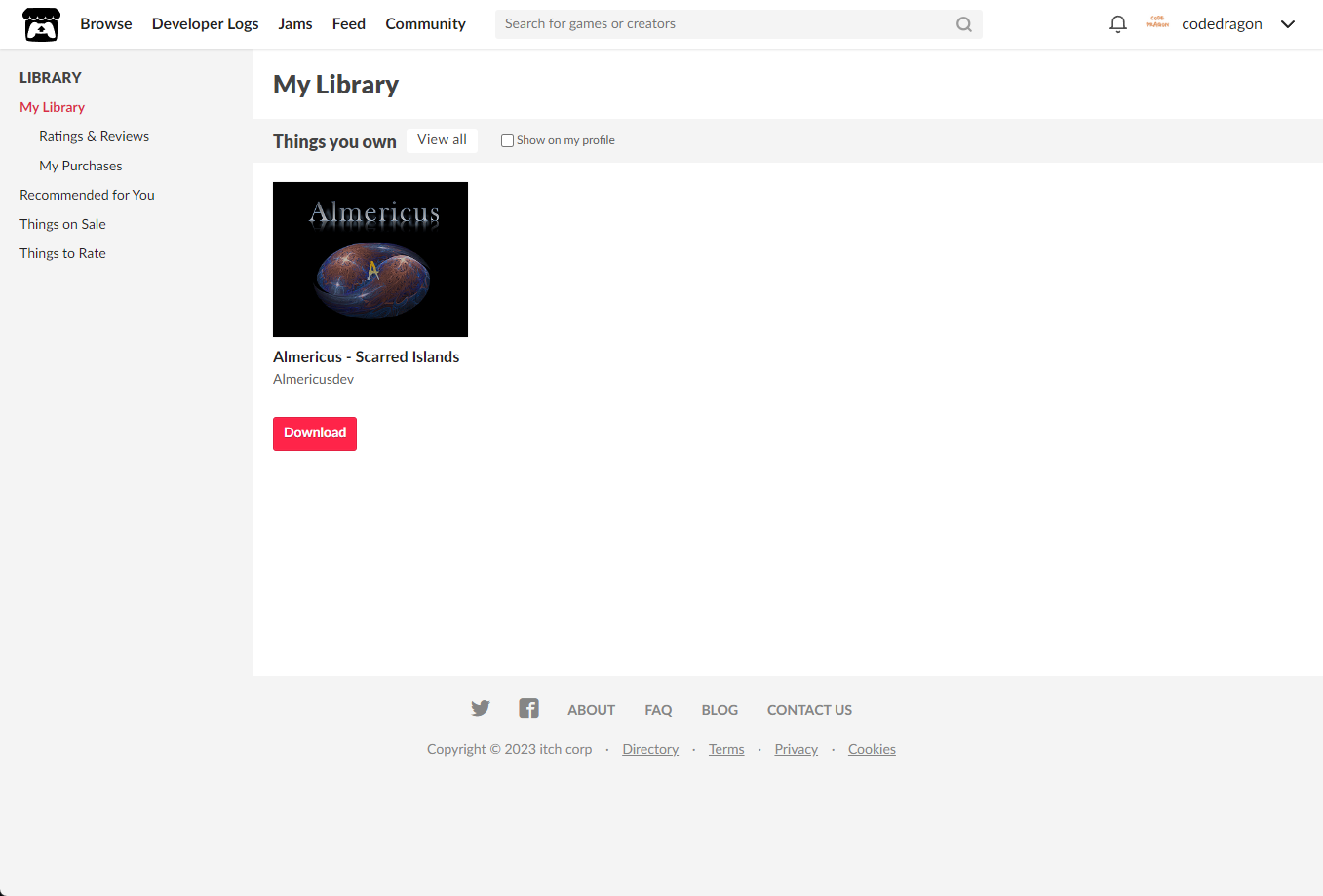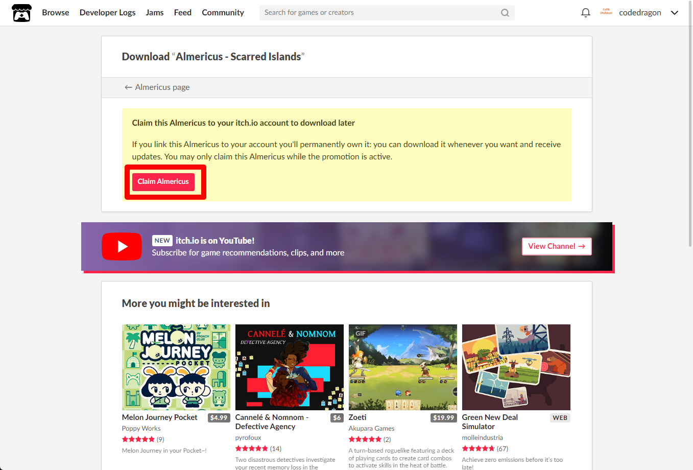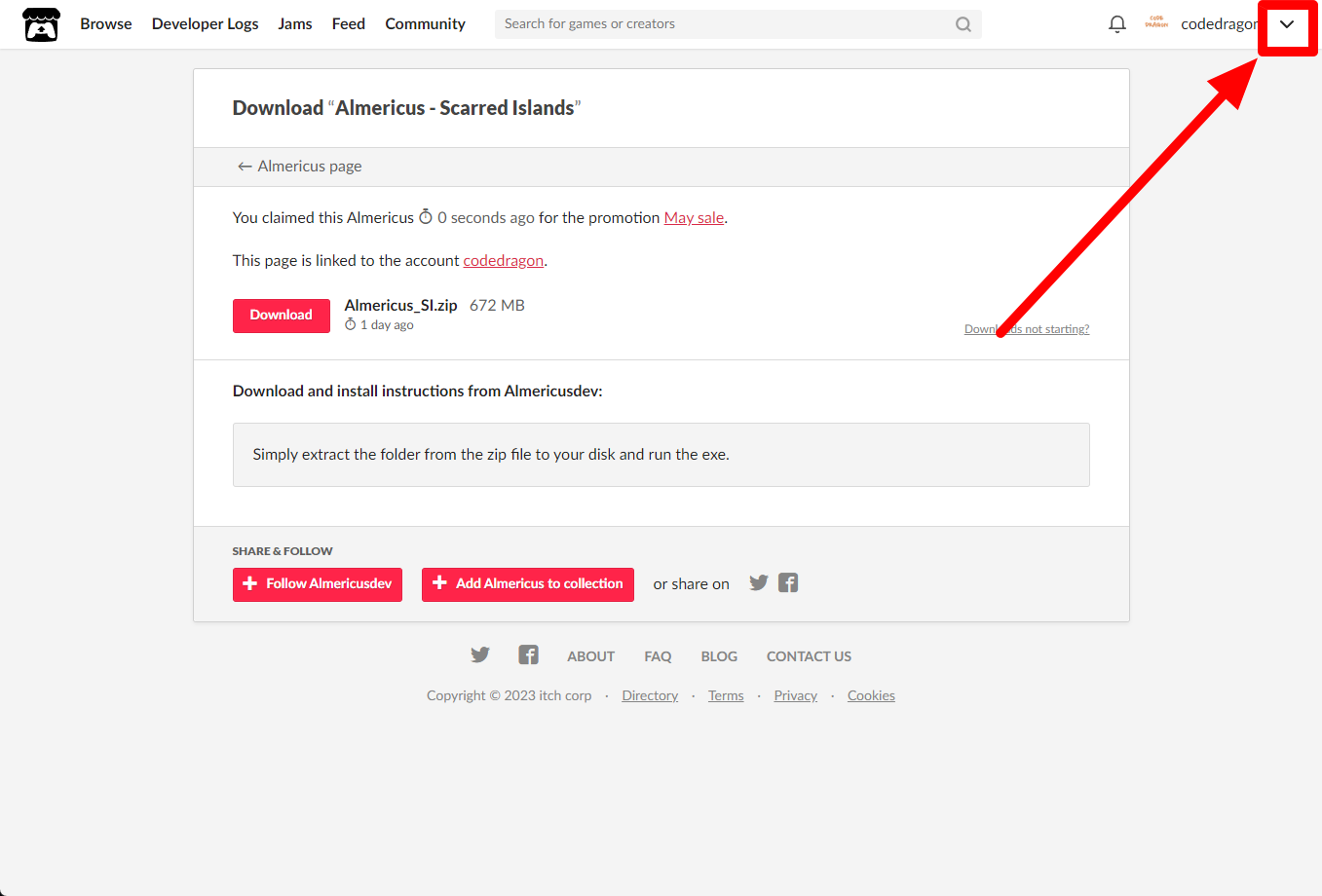 [Claim game]을 클릭하면 "Almericus - Scarred Islands" 게임이 나의 게임 라이브러리에 추가되고 설치파일을 다운받을 수 있는 페이지로 이동됩니다.