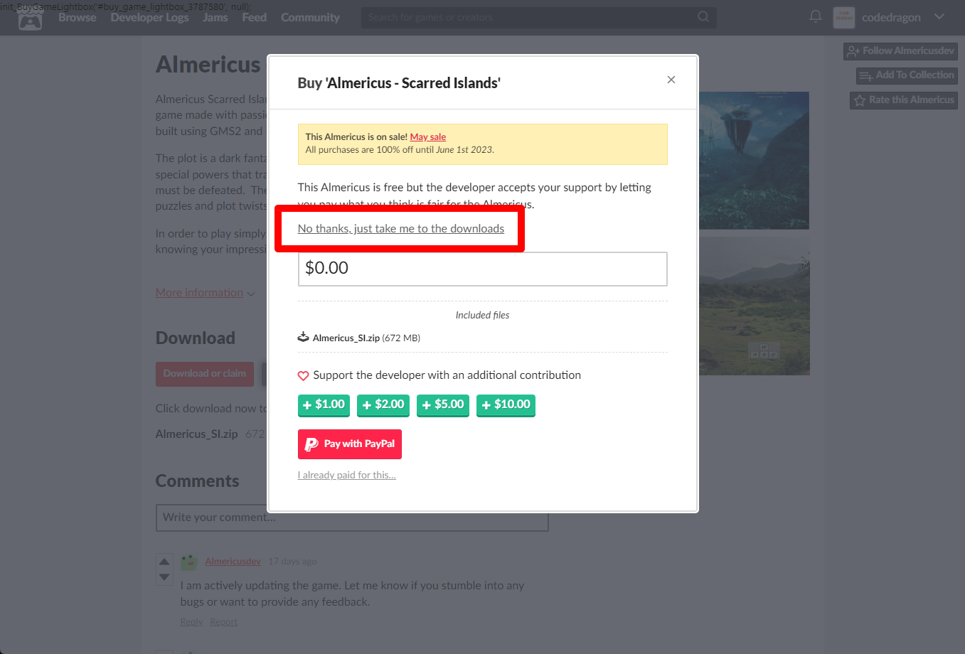 "Almericus - Scarred Islands" 구매 팝업창에서 [No thanks, just take me to the downloads] 링크를 클릭합니다.