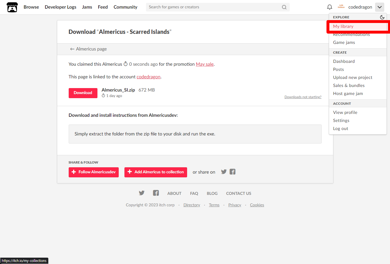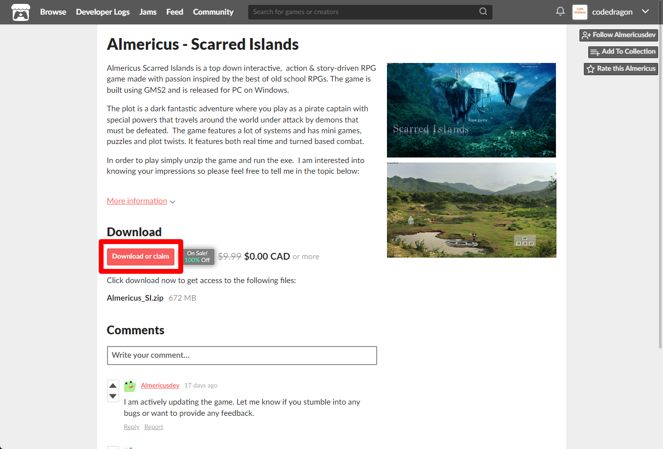 [Claim game]을 클릭하면 "Almericus - Scarred Islands" 게임이 나의 게임 라이브러리에 추가되고 설치파일을 다운받을 수 있는 페이지로 이동됩니다.
