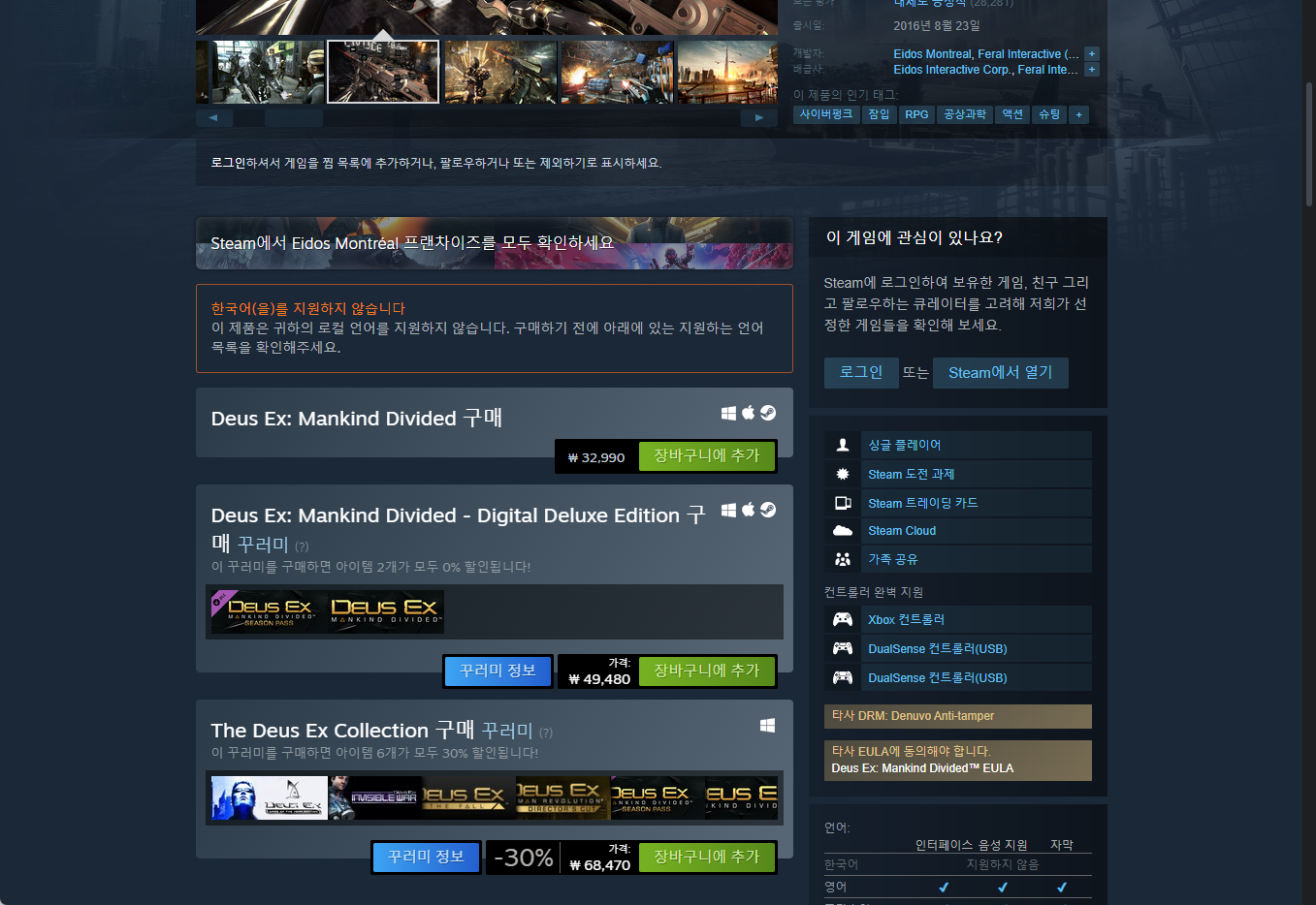 "Deus Ex: Mankind Divided" - Steam 스팀 게임 페이지