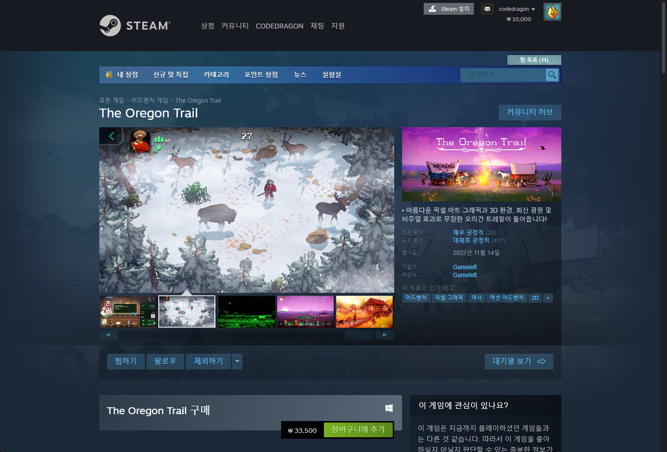 "The Oregon Trail - Cowboys and Critters" 게임페이지를 조금 내려준 후 [계정에 추가] 버튼을 클릭하면 게임라이브러리에 추가됩니다.