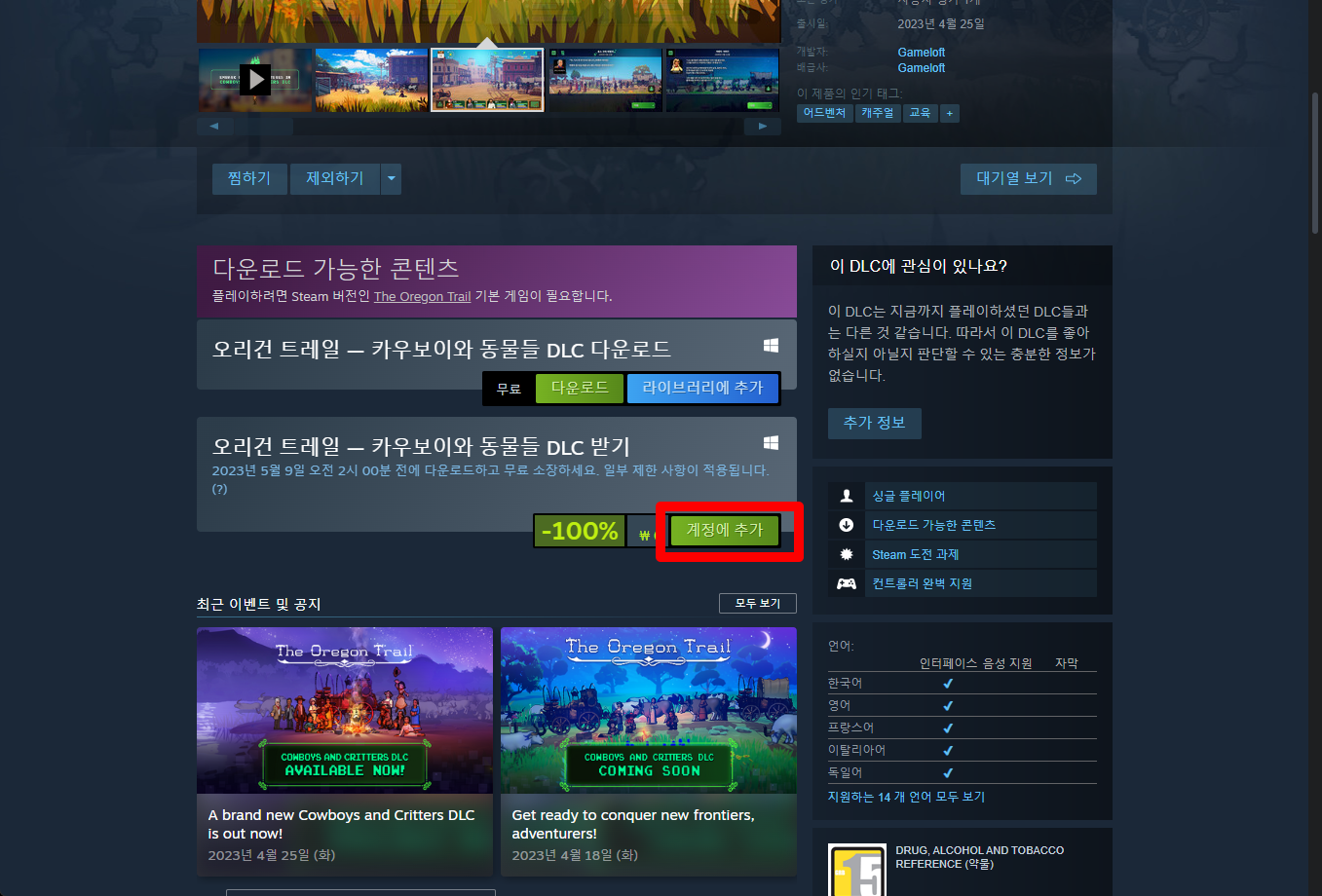 "The Oregon Trail - Cowboys and Critters" 게임페이지를 조금 내려준 후 [계정에 추가] 버튼을 클릭하면 게임라이브러리에 추가됩니다.