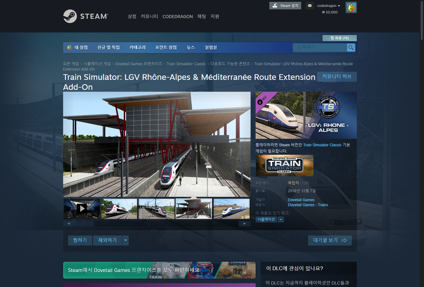 "Train Simulator: LGV Rhône-Alpes & Méditerranée Route Extension Add-On" 해당 DLC를 받기 위해서는 베이스게임(Train Simulator Classic)을 보유하고 있거나 구매해야 합니다.